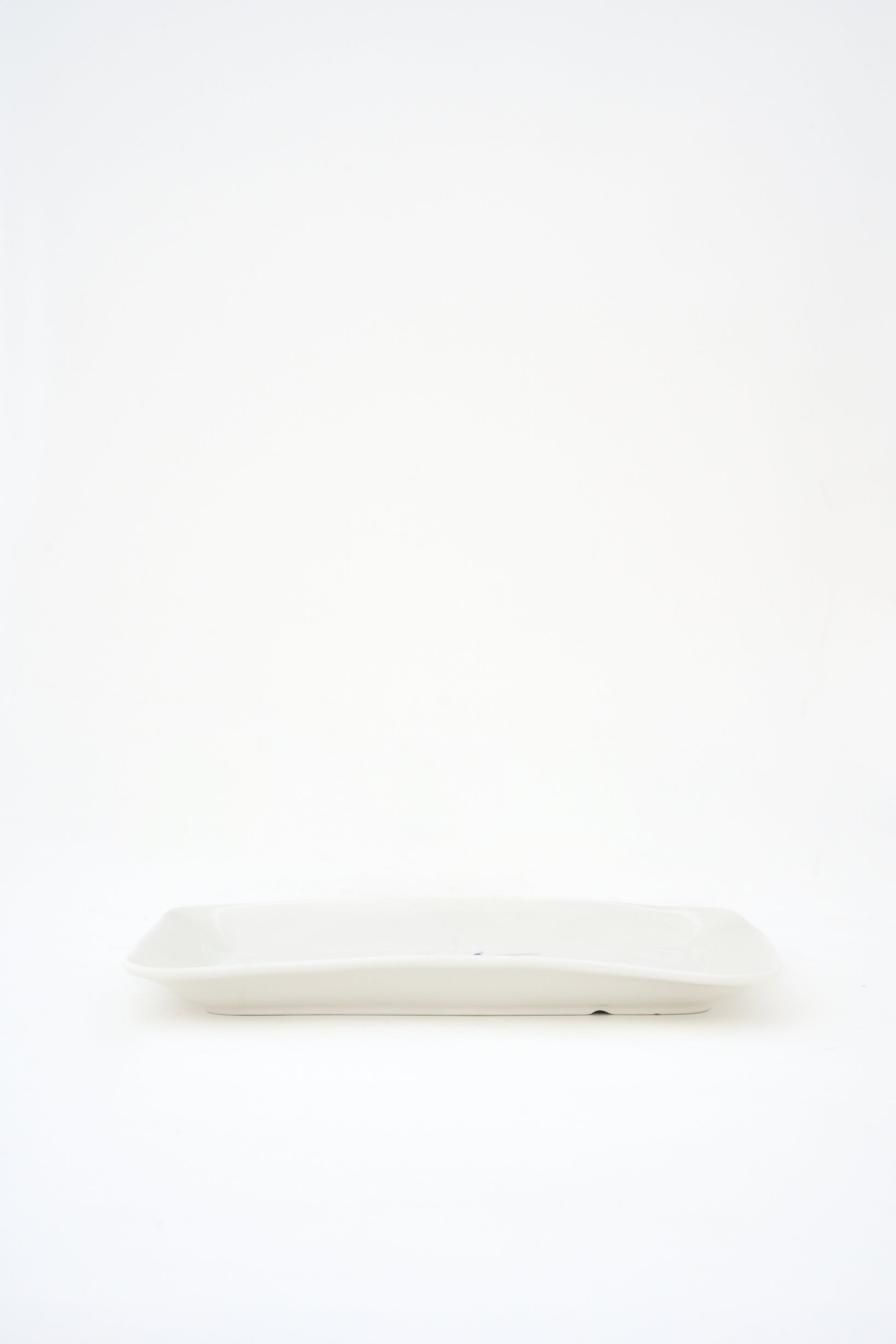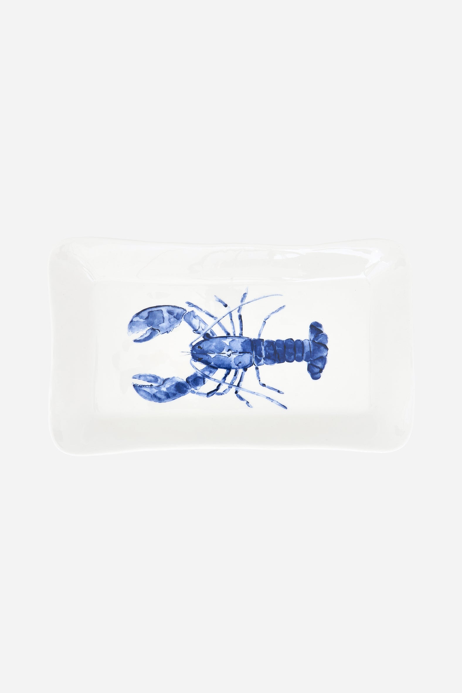 Bandeja rectangular decorada con una langosta pintada en color azul.