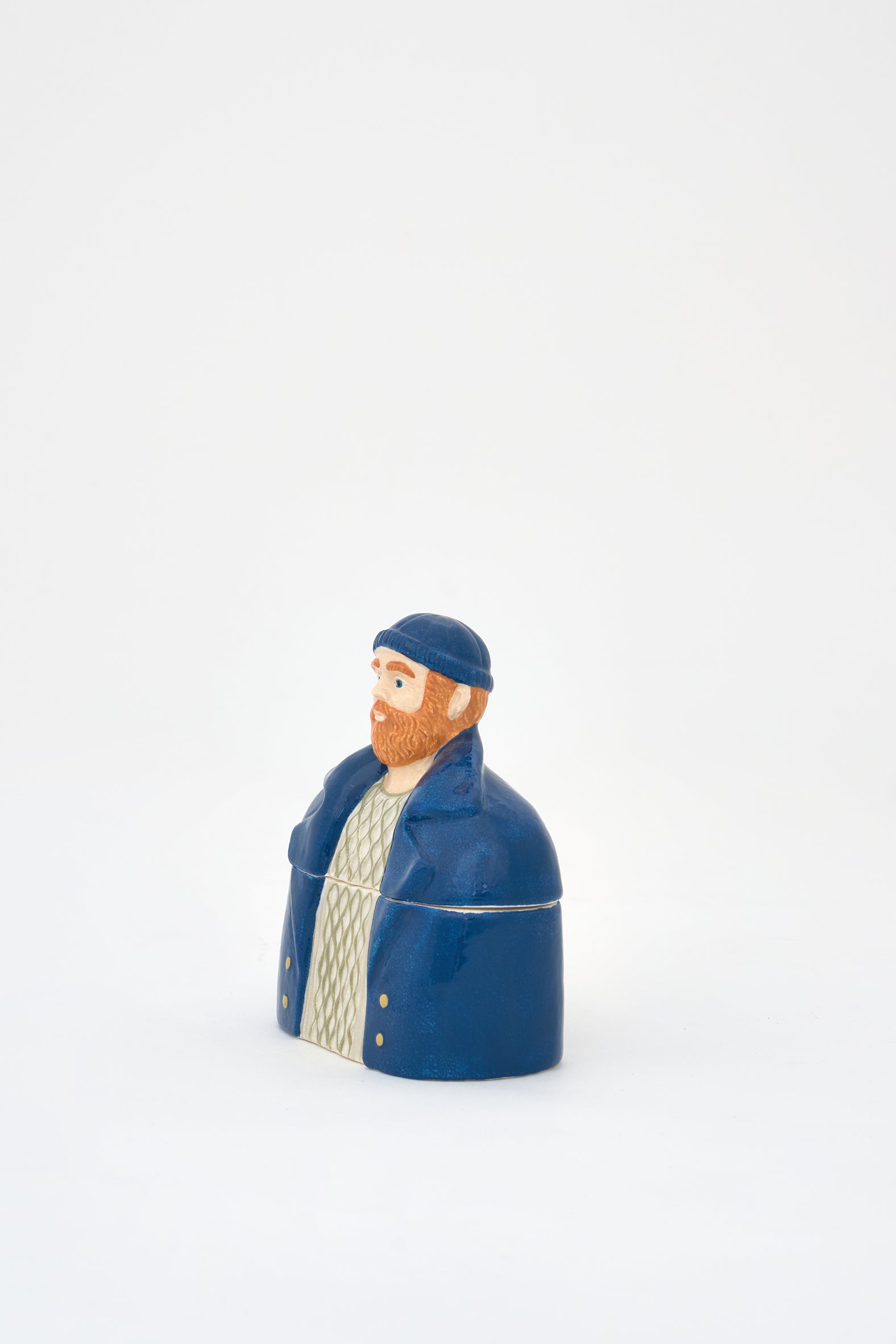 Decorative ceramic box with a fisherman figure in shades of blue and a glazed finish. A functional piece with nautical inspiration, designed to add character and coastal style to any space.
