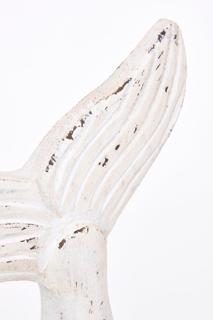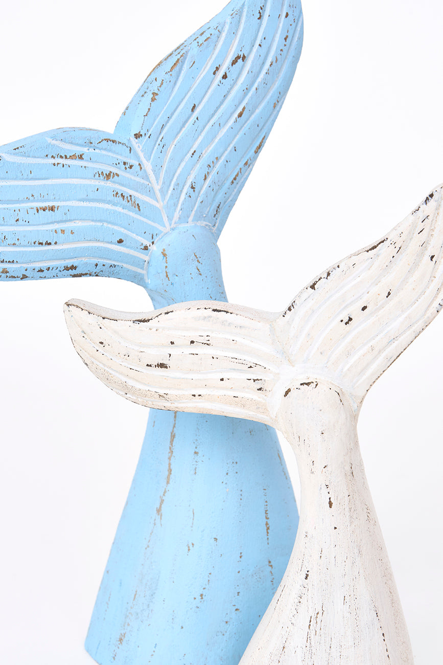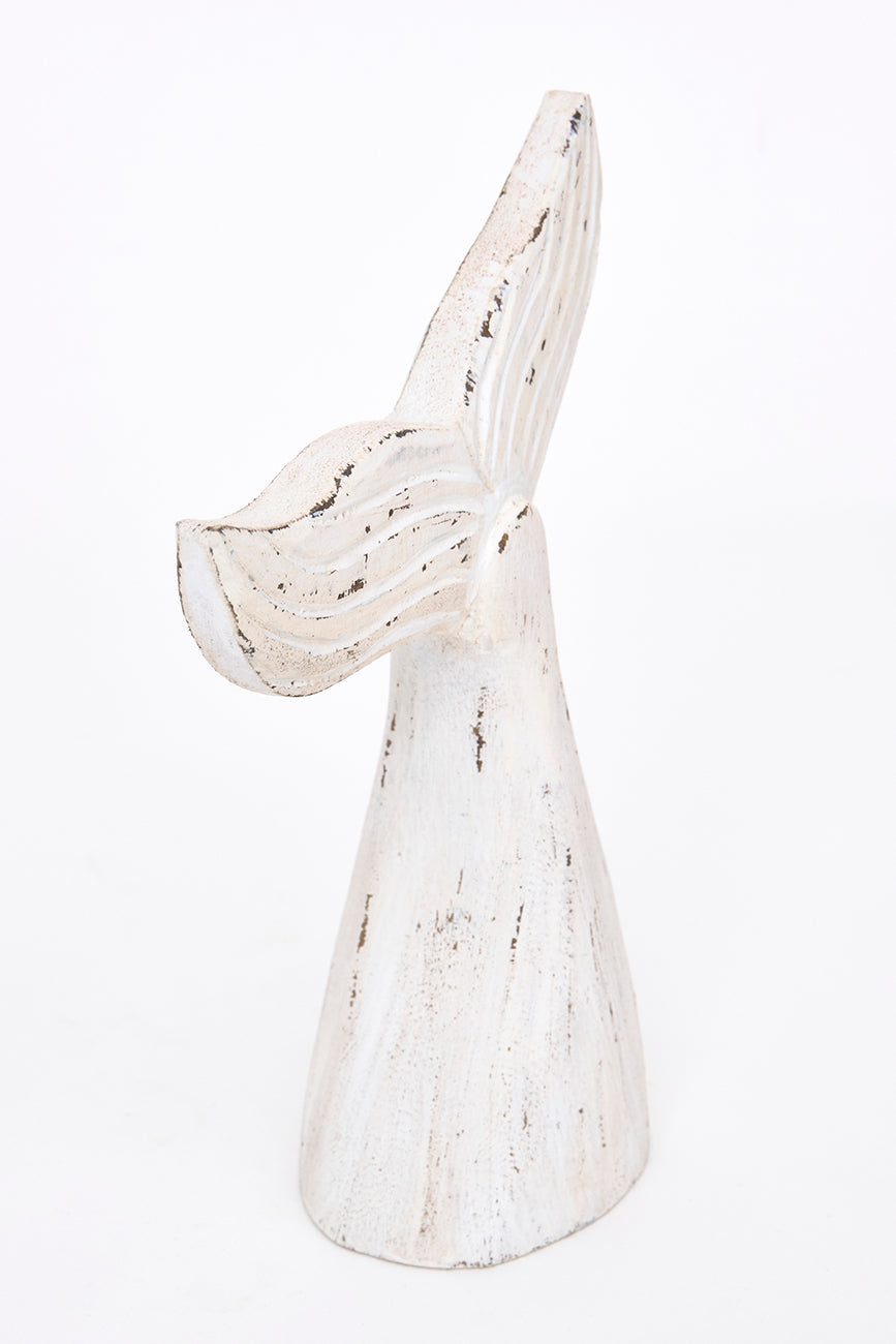 Cola de ballena decorativa elaborada en madera. Pintada en color blanco con un acabado ligeramente envejecido. Un elemento decorativo con inspiración marinera para el hogar.