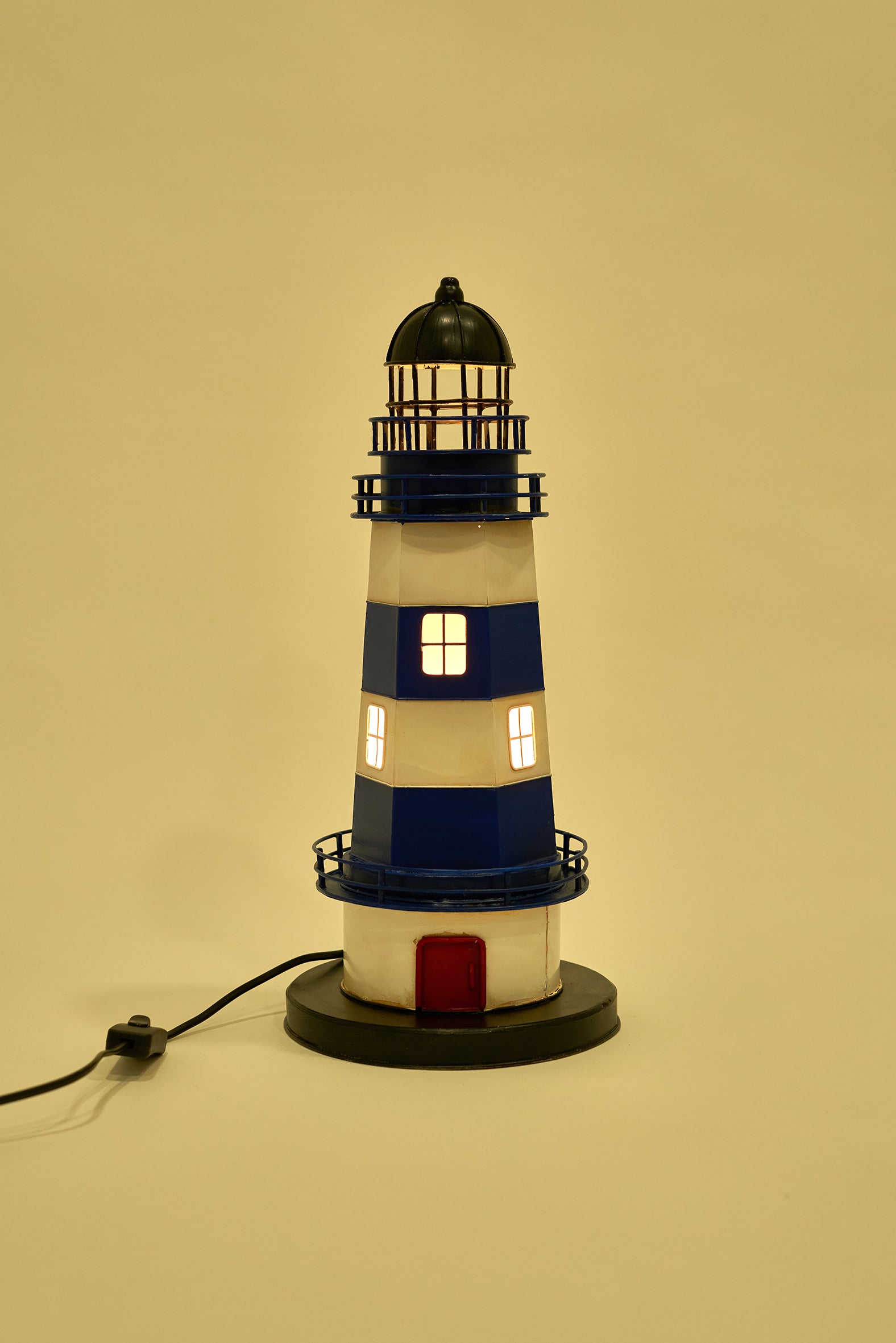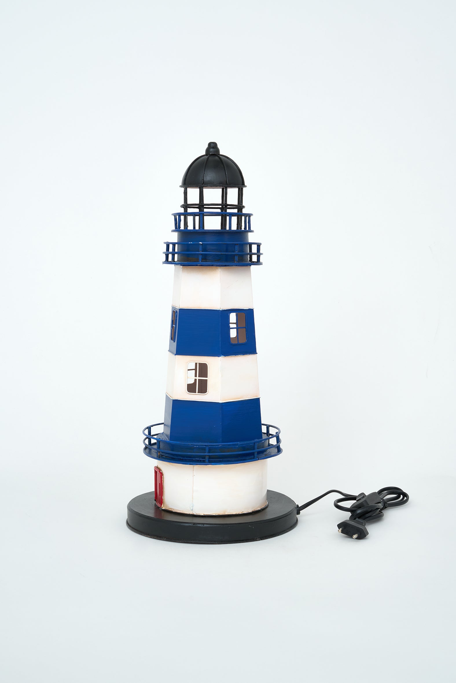Decorative metal lamp shaped like a lighthouse, featuring a combination of blue, white, and red accents. Its classic, balanced design provides ambient light and enhances an elegant nautical aesthetic.