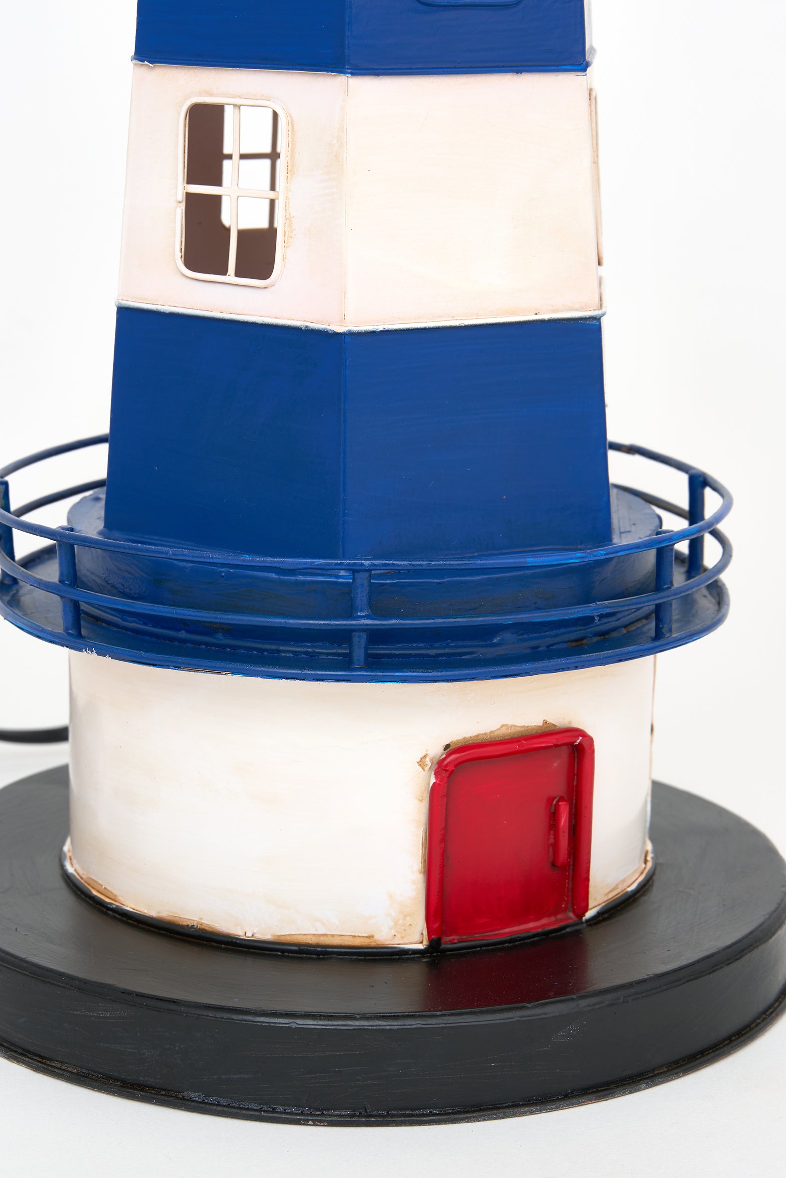 Blue and white metal lighthouse lamp