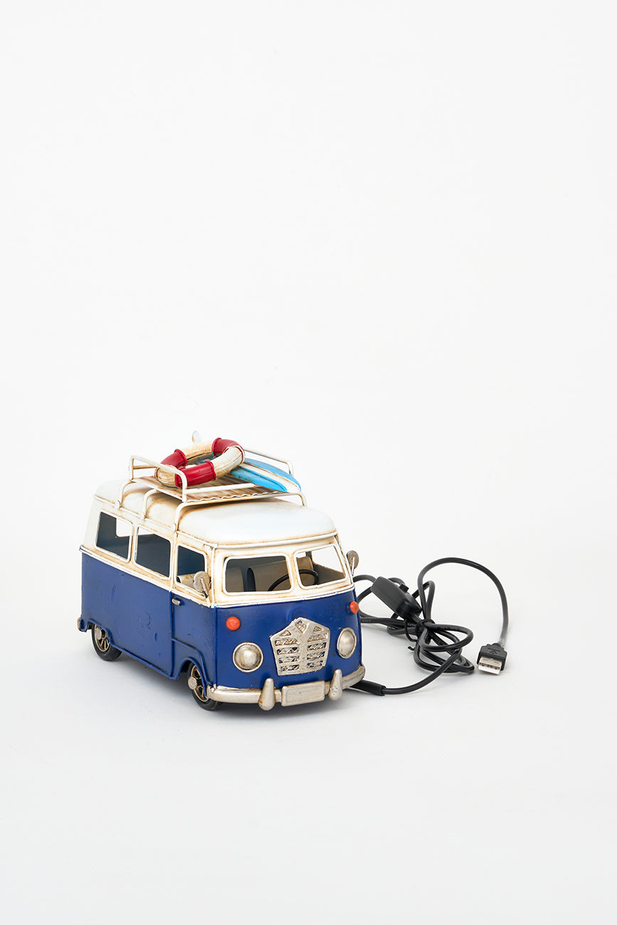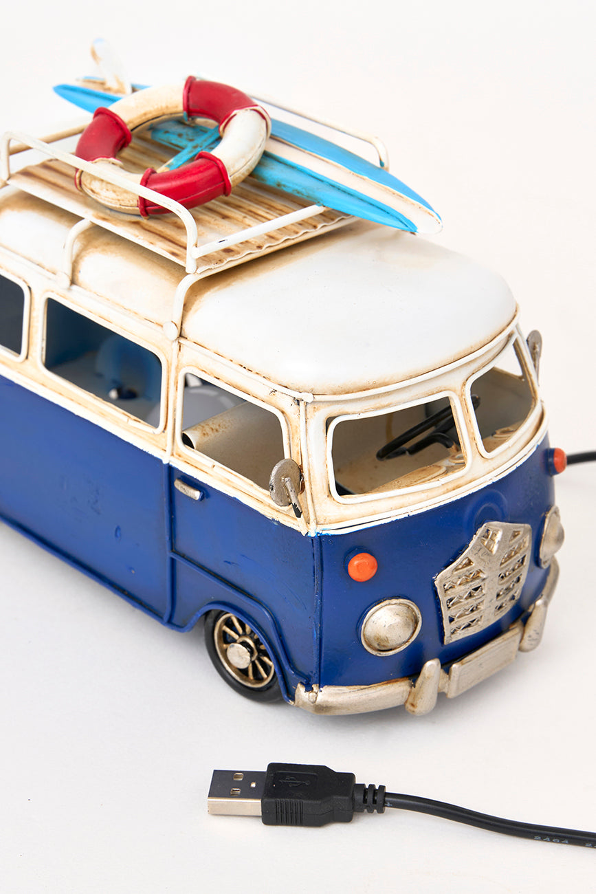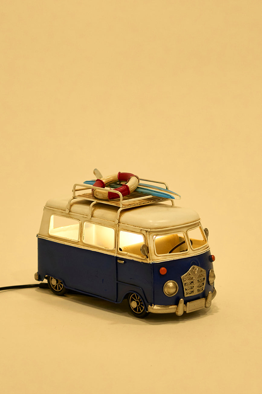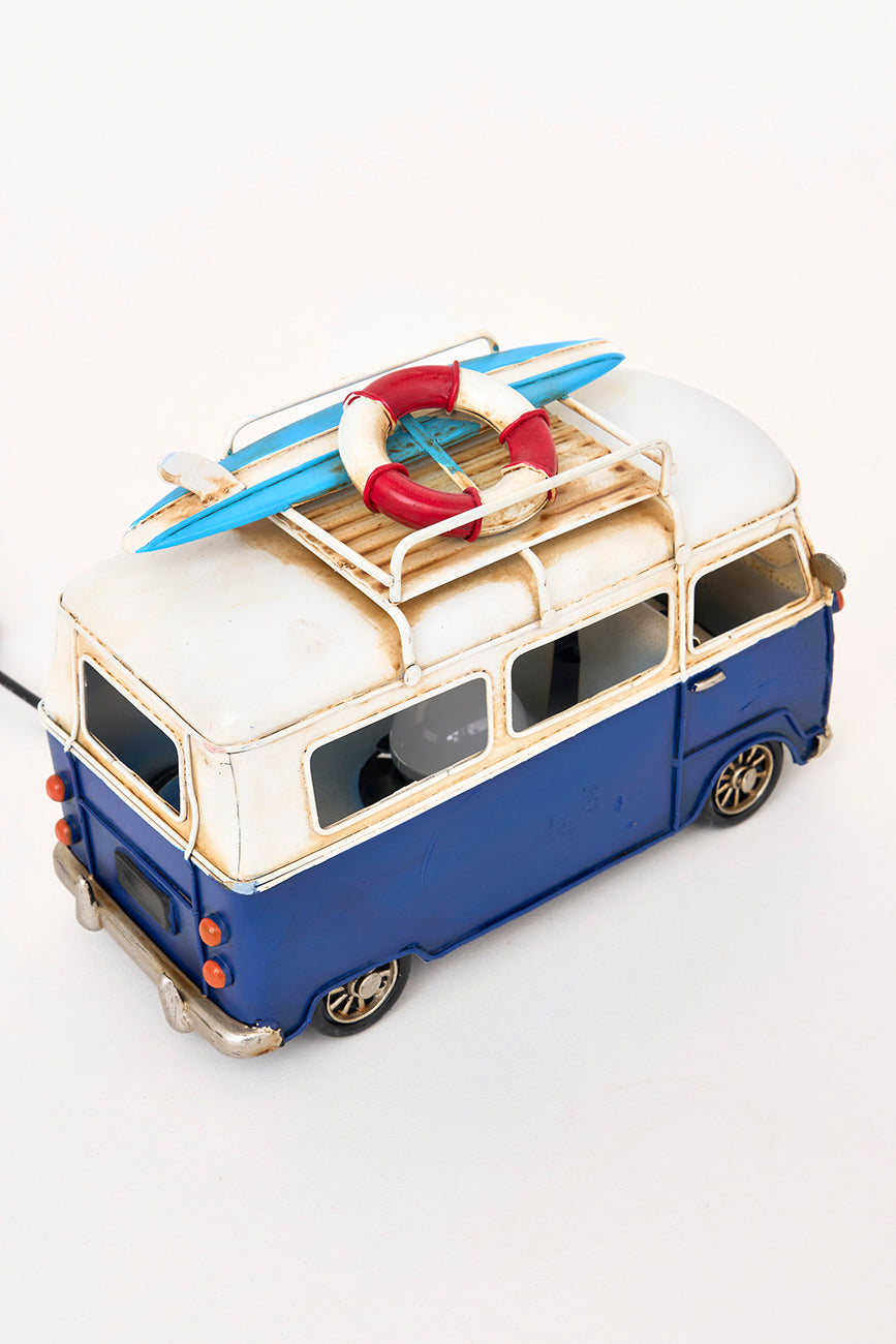 Lámpara decorativa de metal con forma de furgoneta surfera.