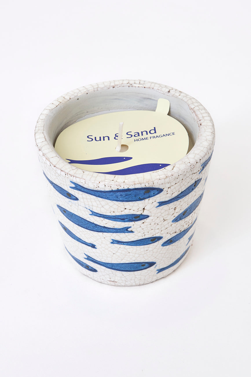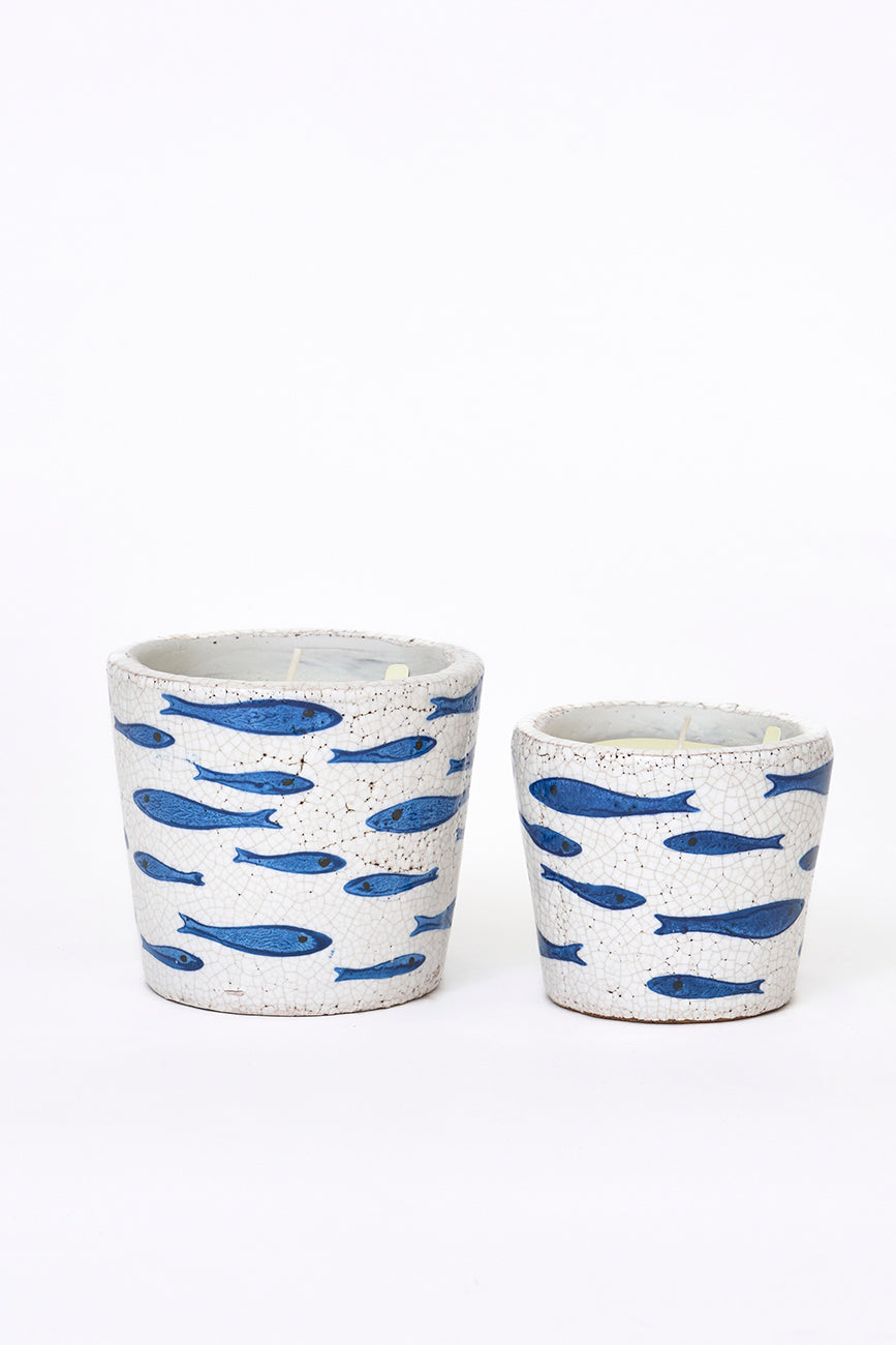 Vela presentada en vasija de terracota decorada con peces pintados. El acabado rústico aporta calidez y carácter. Ideal para crear ambientes agradables y acogedores.