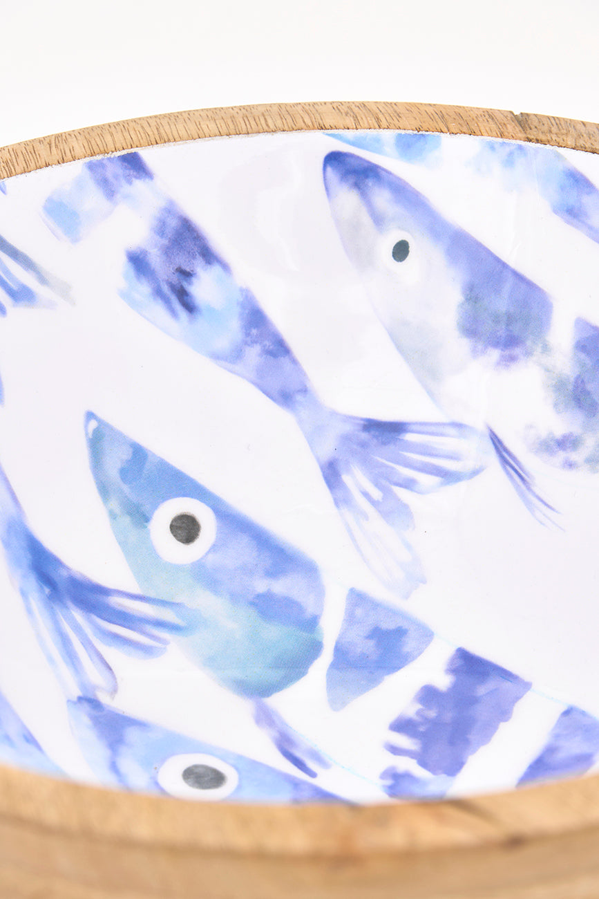 Bol pequeño elaborado en madera con el interior esmaltado en blanco. Presenta un delicado diseño de un banco de peces en su interior. Una pieza decorativa y funcional con inspiración marinera.
