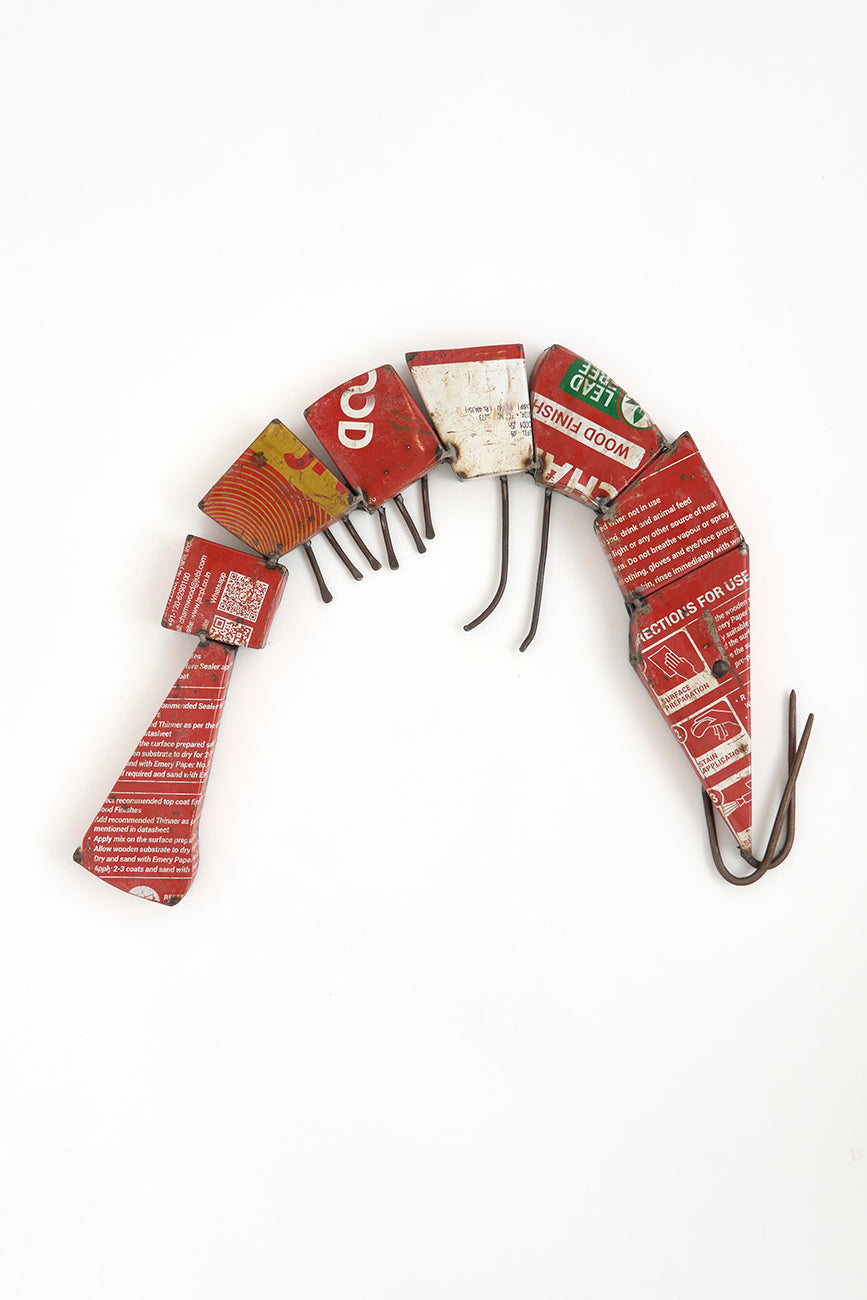 Gamba decorativa elaborada en metal reciclado, pintada en color rojo. De gran tamaño, está diseñada para decorar paredes. Una pieza llamativa que aporta un toque marinero y artesanal al espacio.