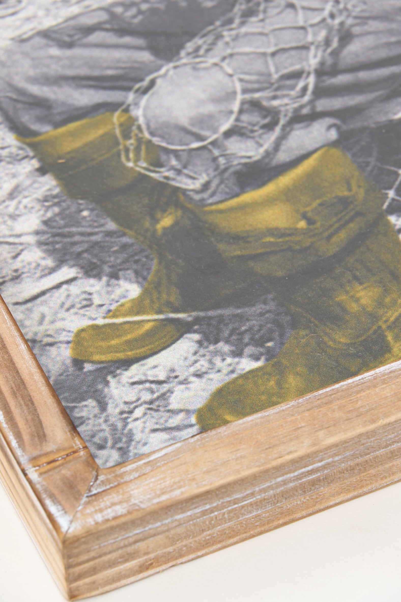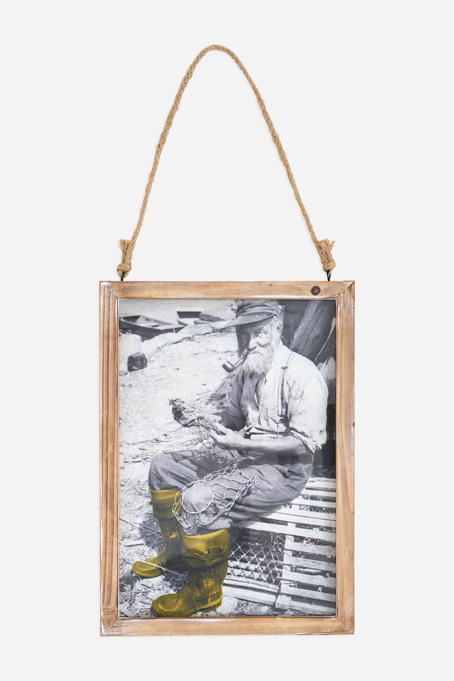 Decorative painting with nautical inspiration featuring a classic fisherman scene, presented in a natural wood frame and rope hanging system.