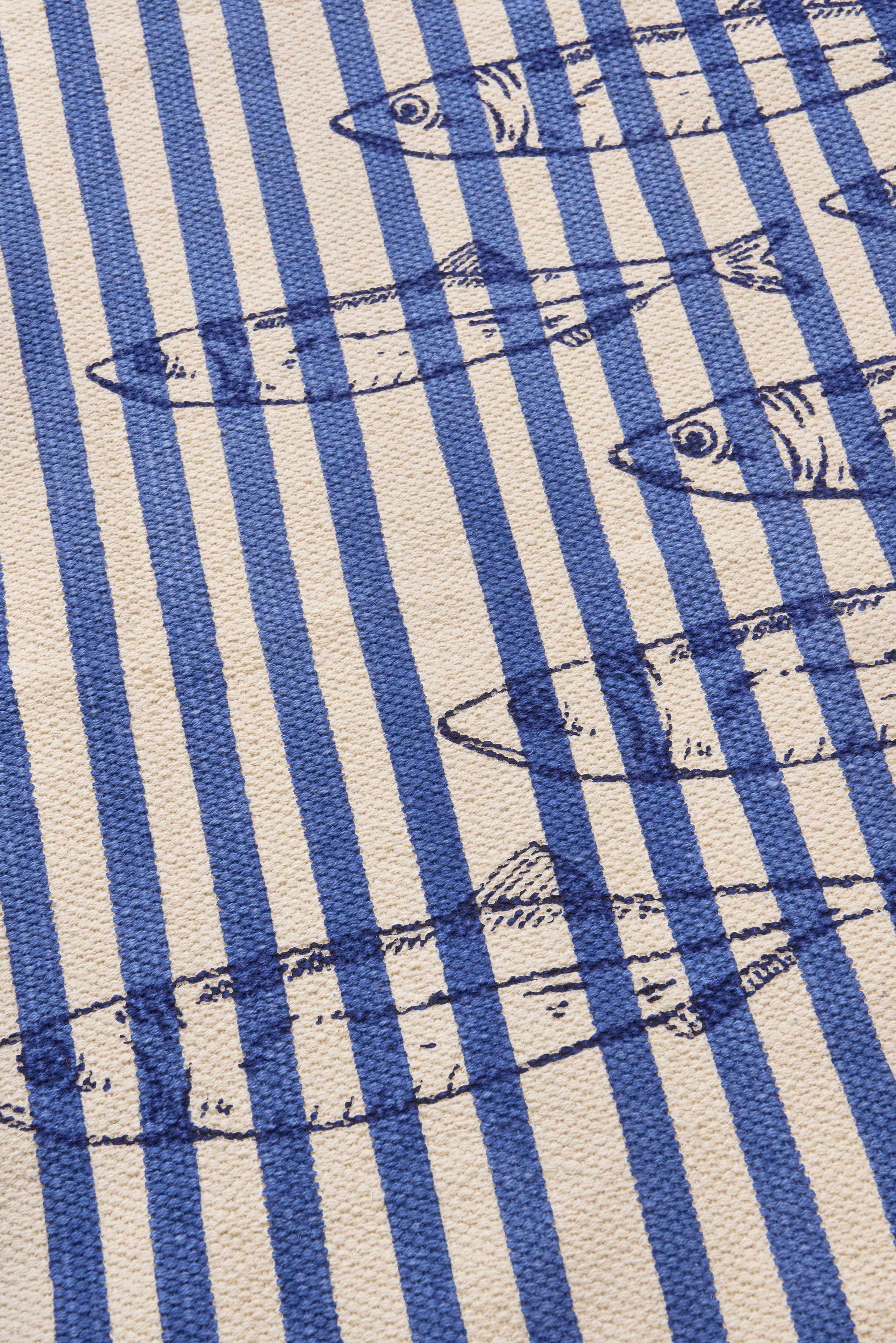Alfombra de algodón con rayas verticales y estampado de peces en tonos azules, inspirado en el estilo marinero clásico. Un diseño funcional y decorativo que aporta un aire fresco y costero.