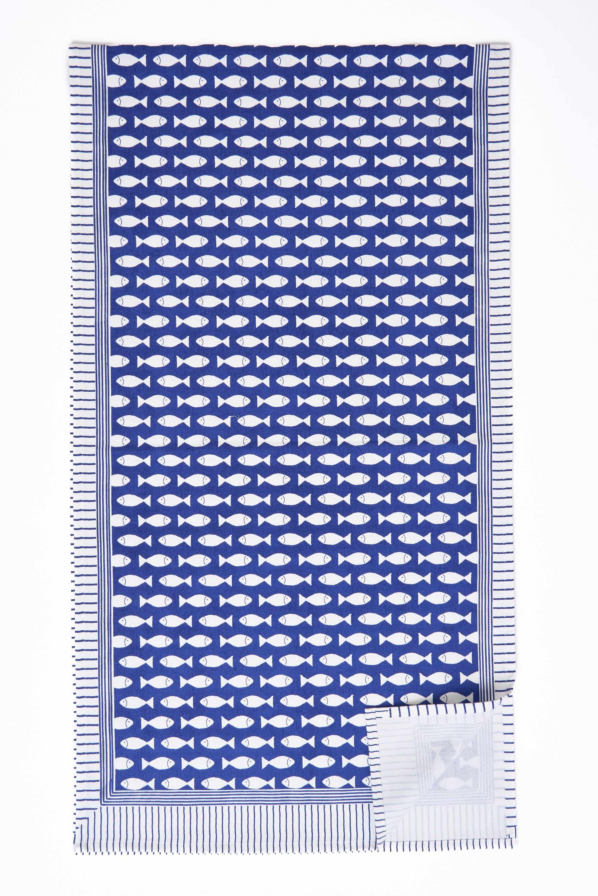 Camino de mesa de algodón con estampado de peces en blanco sobre fondo azul. Ideal para vestir la mesa con un estilo marinero fresco y aportar un toque decorativo sin recargar.