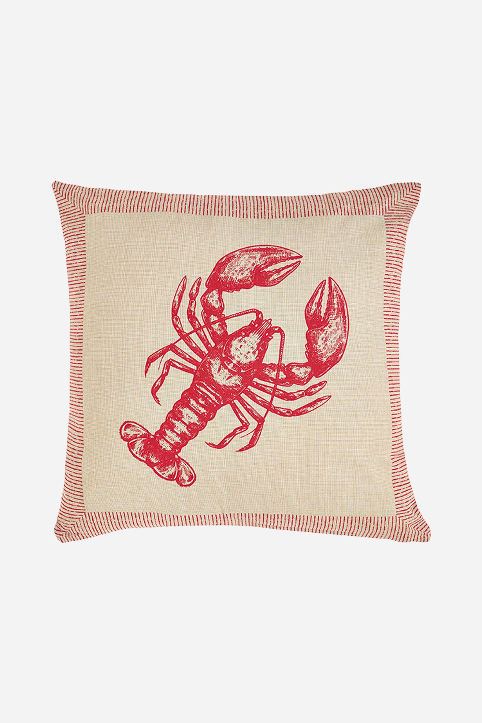 Cojín de algodón con ilustración de langosta en tono rojo sobre fondo claro. Un diseño con carácter marino que aporta contraste y personalidad a cualquier espacio