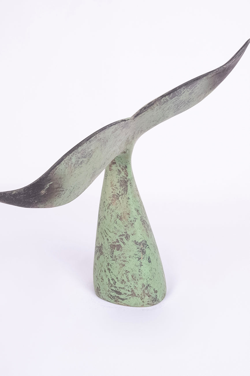 Preciosa cola de ballena hecha en resina. Tiene una pátina verde moteada que recuerda al bronce.