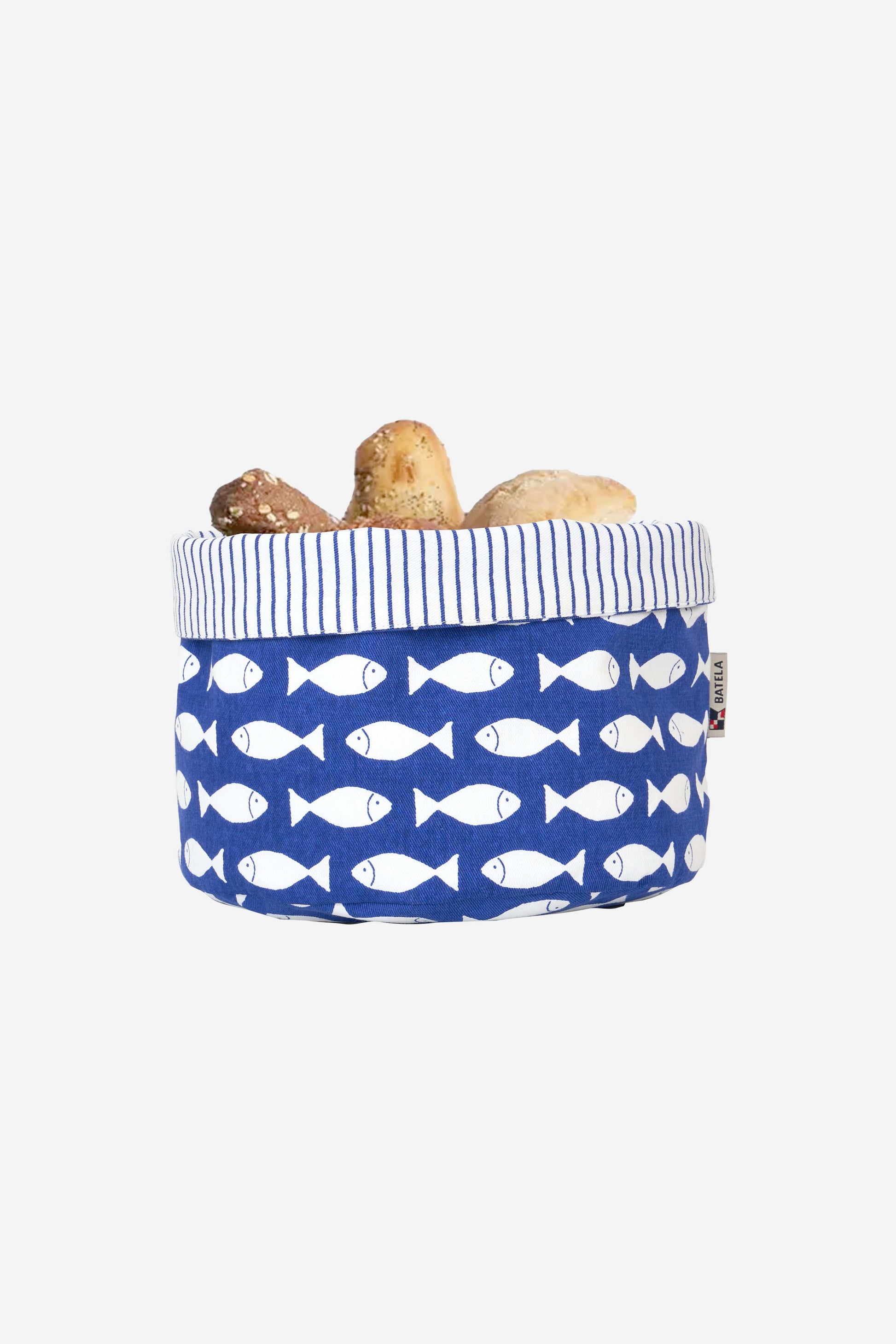 Panera textil de algodón con peces blancos sobre fondo azul y forro interior blanco. Práctica y decorativa, ideal para pan o bollería con estilo marinero.