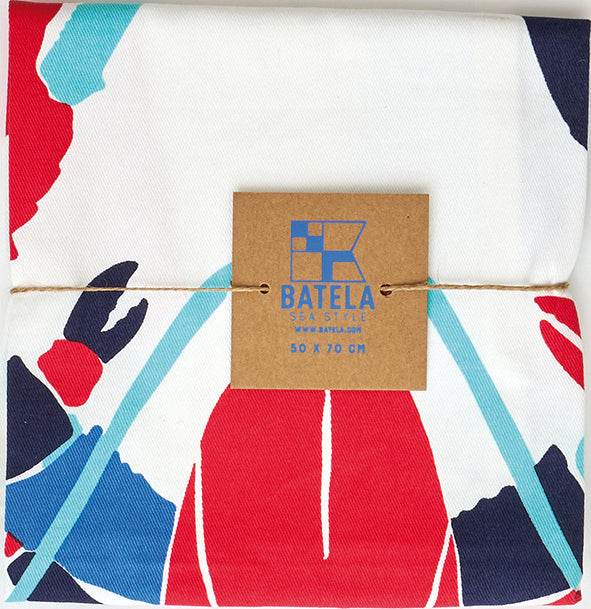 Paño de cocina de algodón con ilustración de langosta en tonos rojo, azul y turquesa sobre fondo claro. Su diseño gráfico aporta un toque marinero al día a día, combinando funcionalidad y estilo en la cocina.
