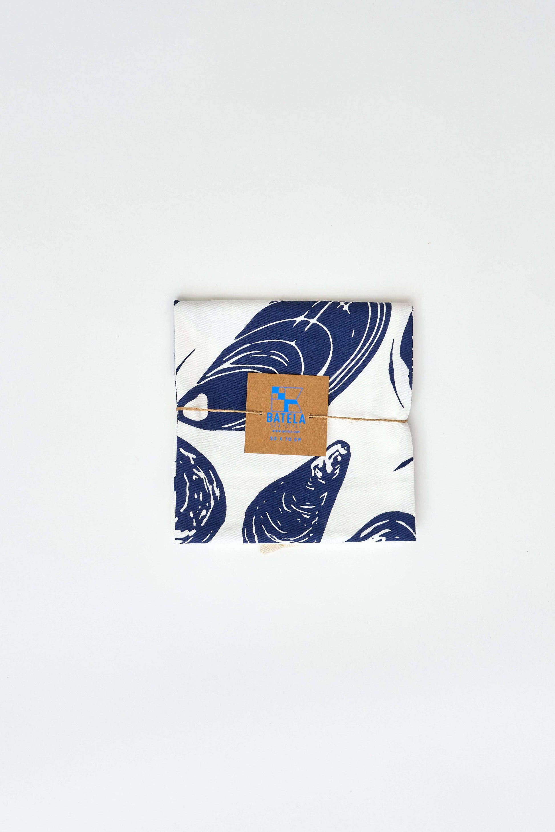 Paño de cocina de algodón con estampado de mejillones en azul sobre fondo blanco. Un diseño marinero sencillo y funcional, pensado para el uso diario en la cocina con un aire fresco y costero.