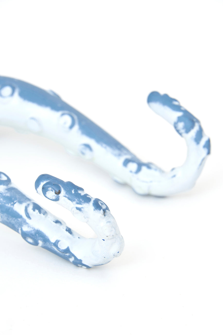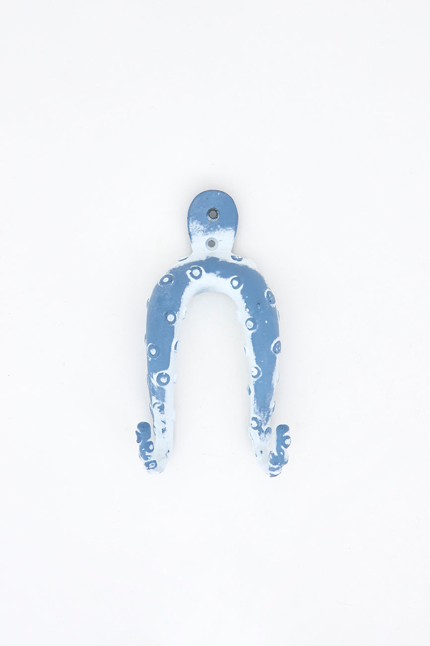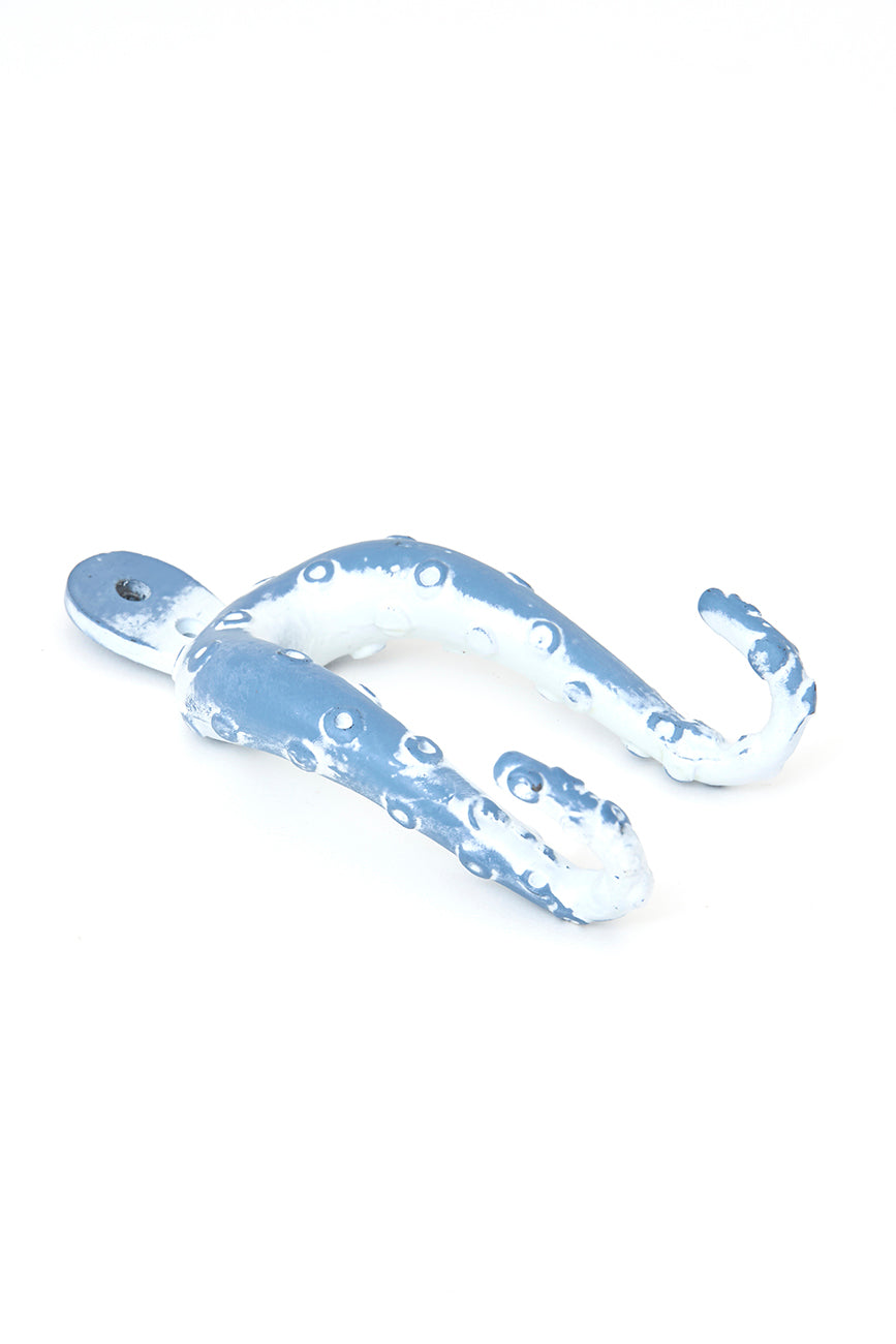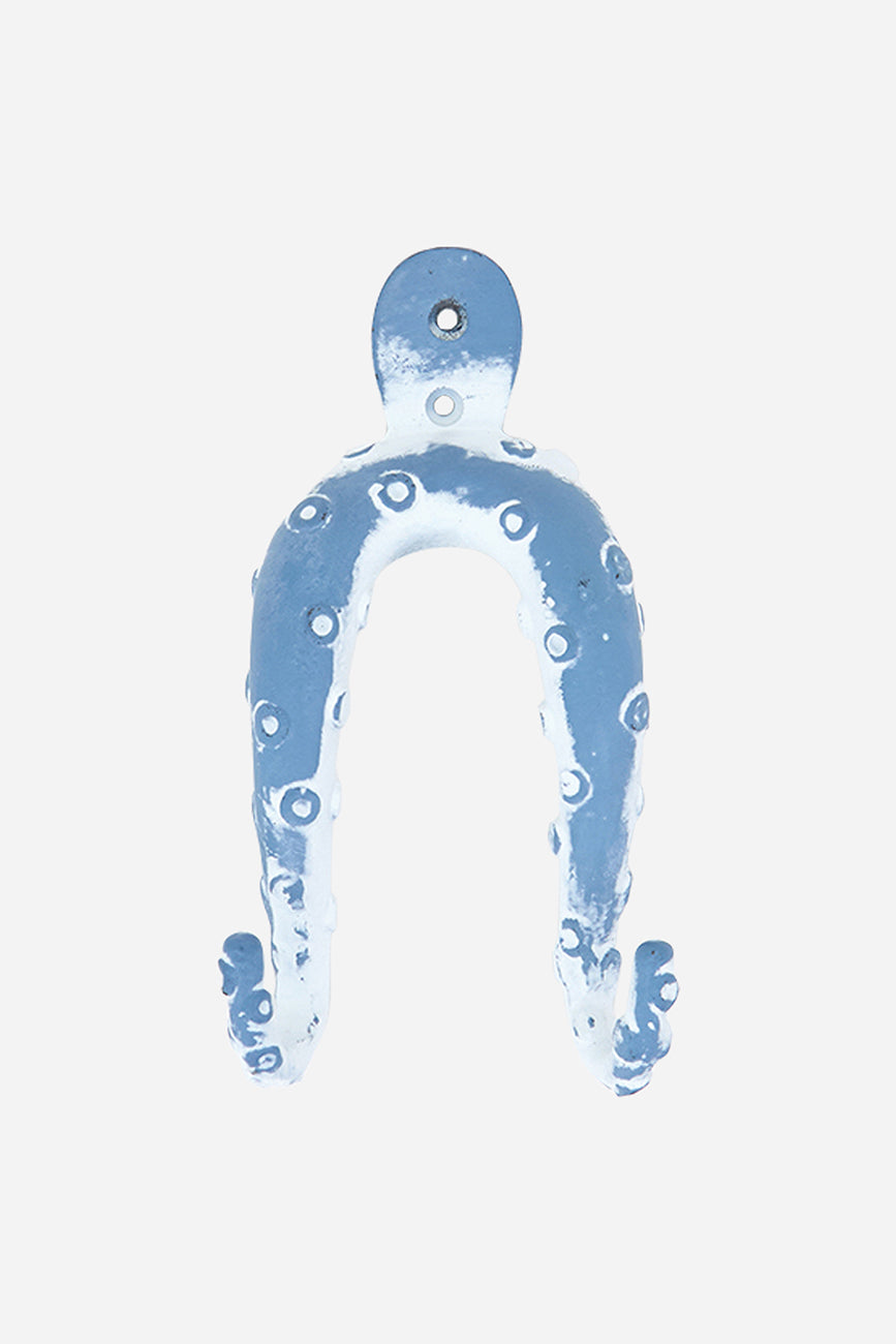 Perchero decorativo de metal con forma de pulpo, pintado en azul cielo con acabado envejecido.