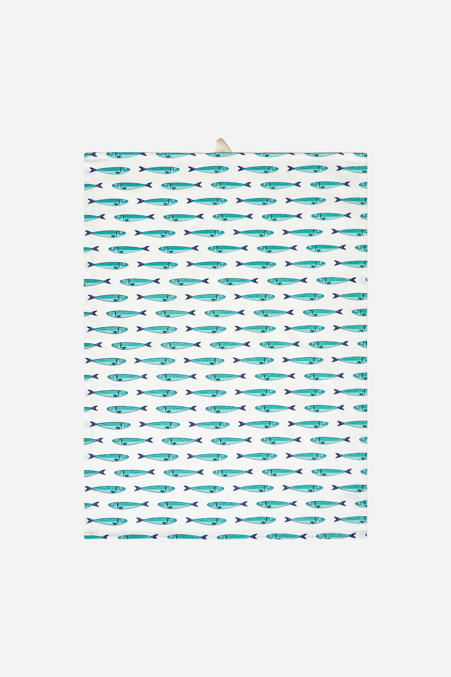 Set de paños de cocina de algodón con estampado repetido de peces en tonos marinos. Un básico funcional para el día a día que aporta un toque fresco y costero a la cocina.