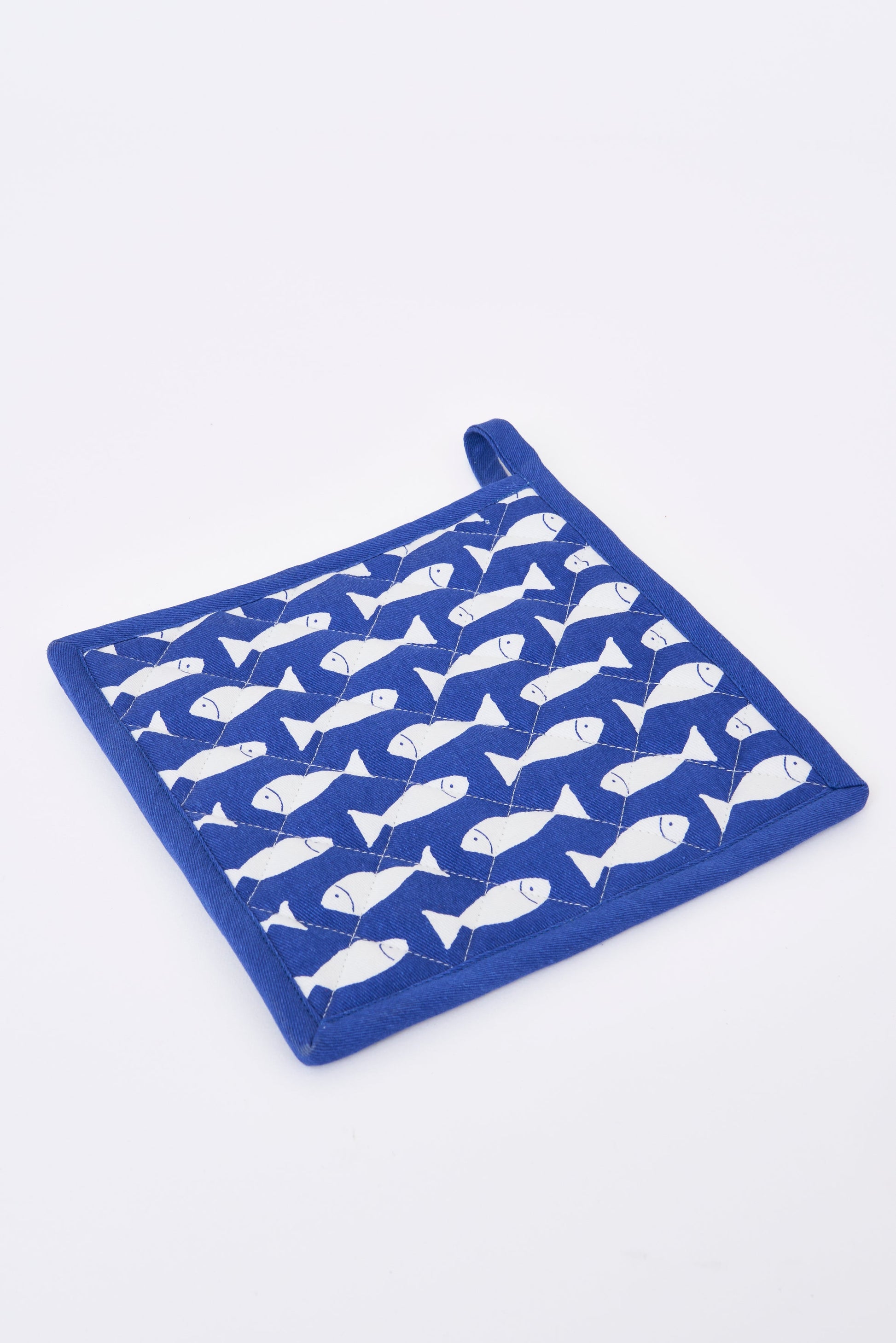 Set de cocina en algodón con estampado de peces blancos sobre fondo azul. Incluye manopla y agarrador acolchados, prácticos y coordinados, ideales para un uso diario con estilo marinero.