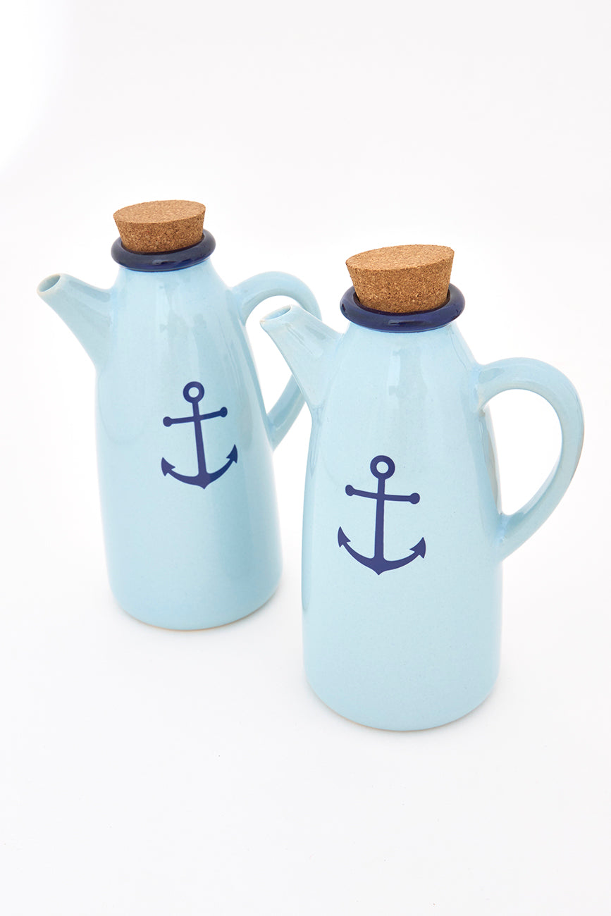 Set para ensaladas pintado en color azul pastel y decorado con un ancla en azul marino.