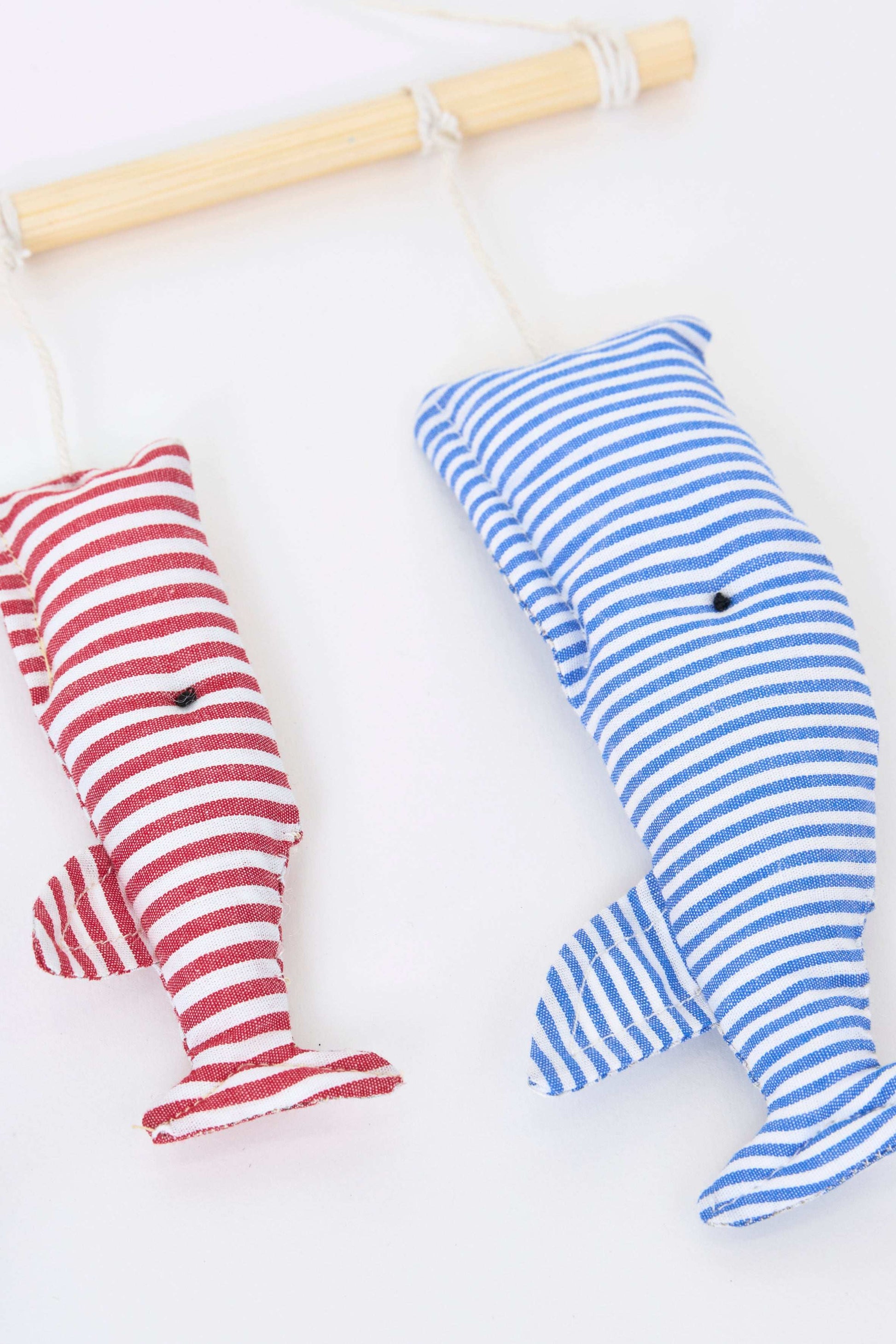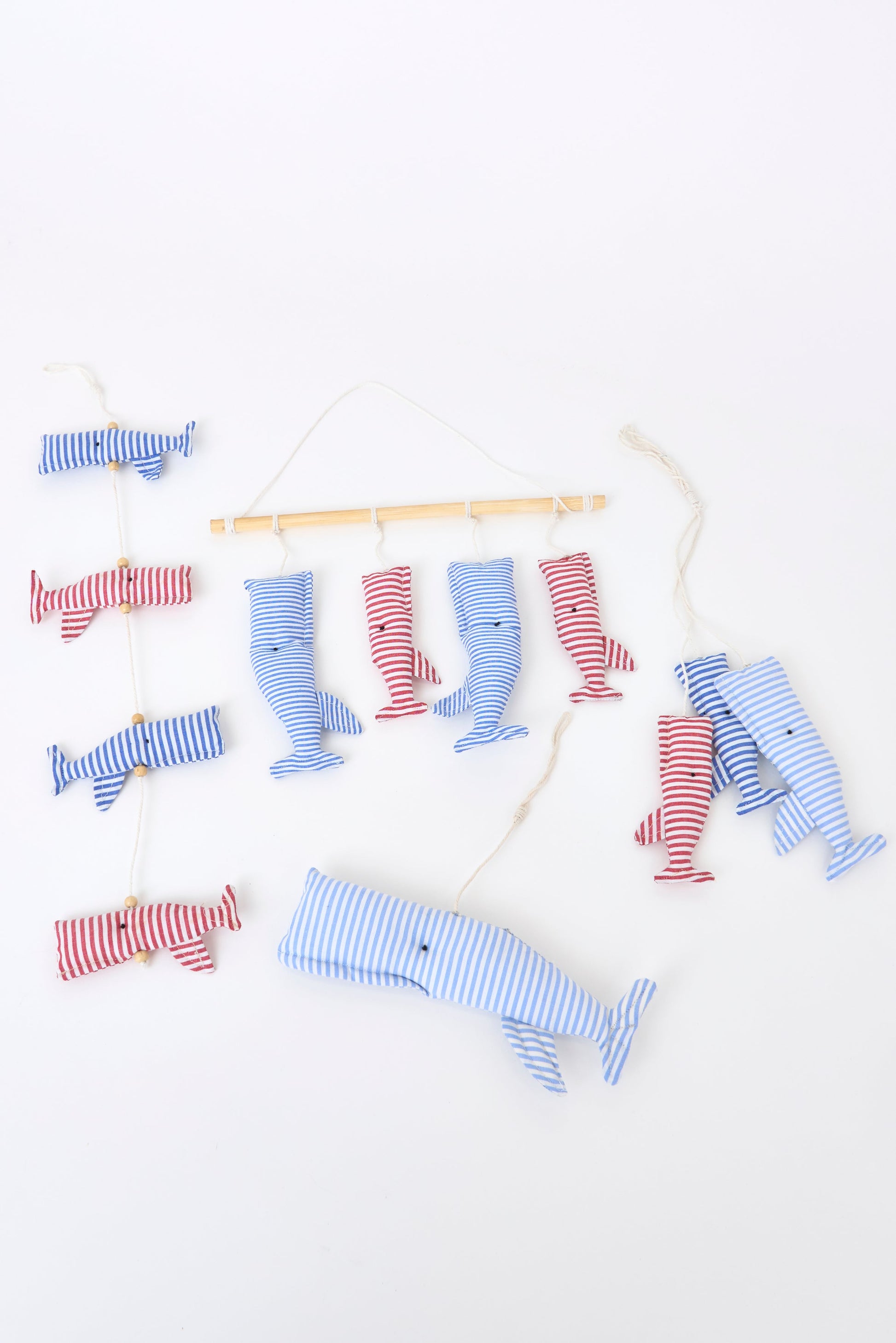 Móvil decorativo con ballenas de peluche elaborada en algodón.
