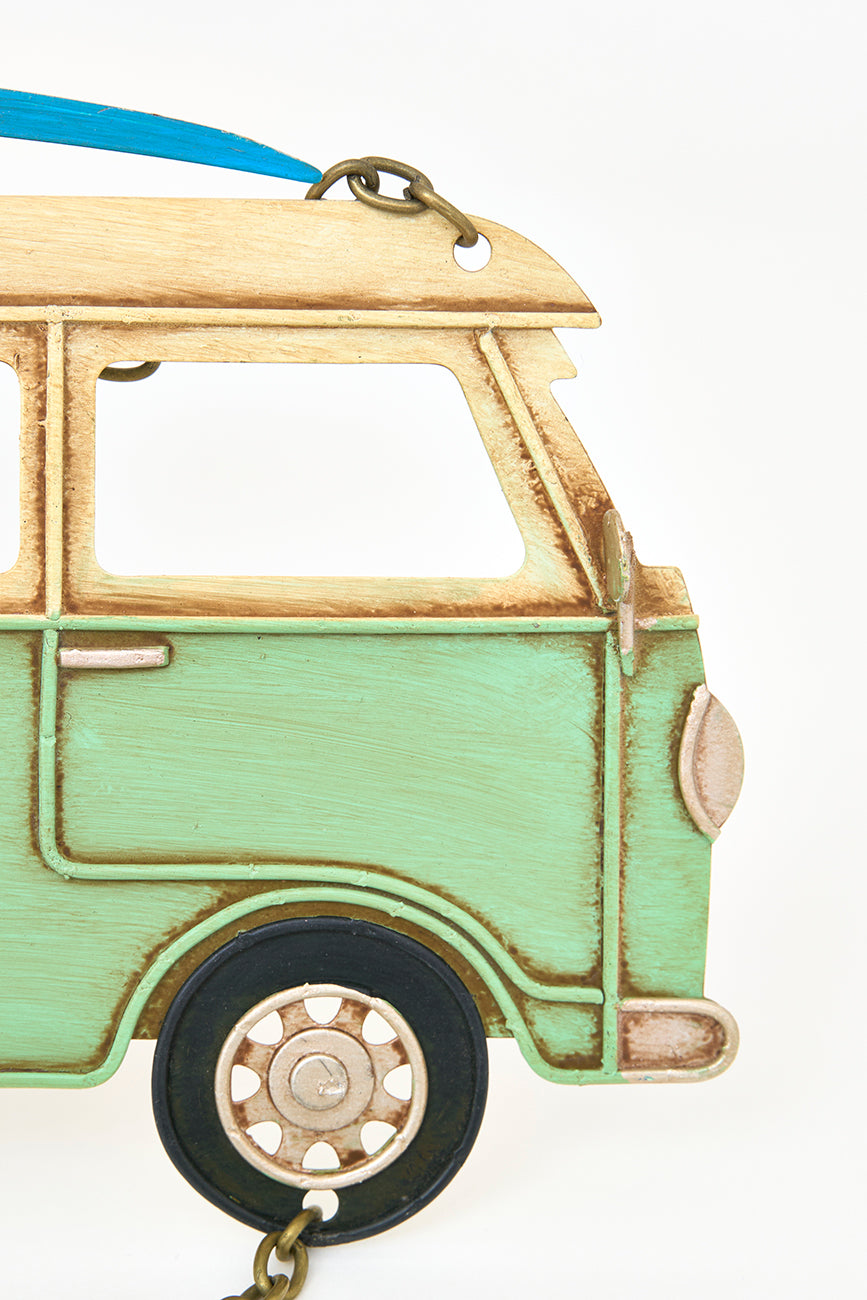 Colgante decorativo de metal con una furgoneta surfera y el texto “Gone Surfing”.