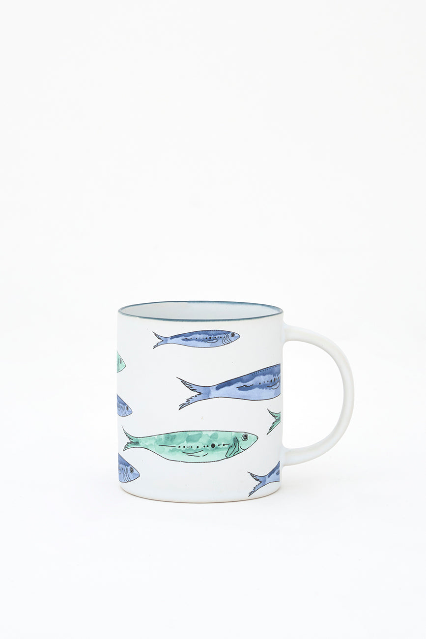 Taza elaborada en gres y decorada con un banco de peces pintado. Combina con el plato grande del mismo diseño. Una pieza funcional con un marcado estilo marinero.
