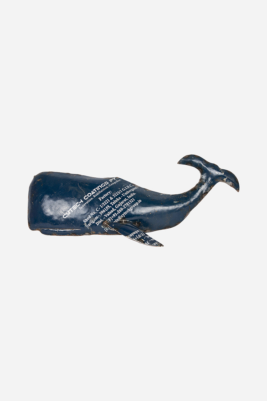 Décoration nautique en forme de baleine bleue, réalisée à partir de métal récupéré à partir de fûts recyclés. Une décoration nautique unique pour la maison.