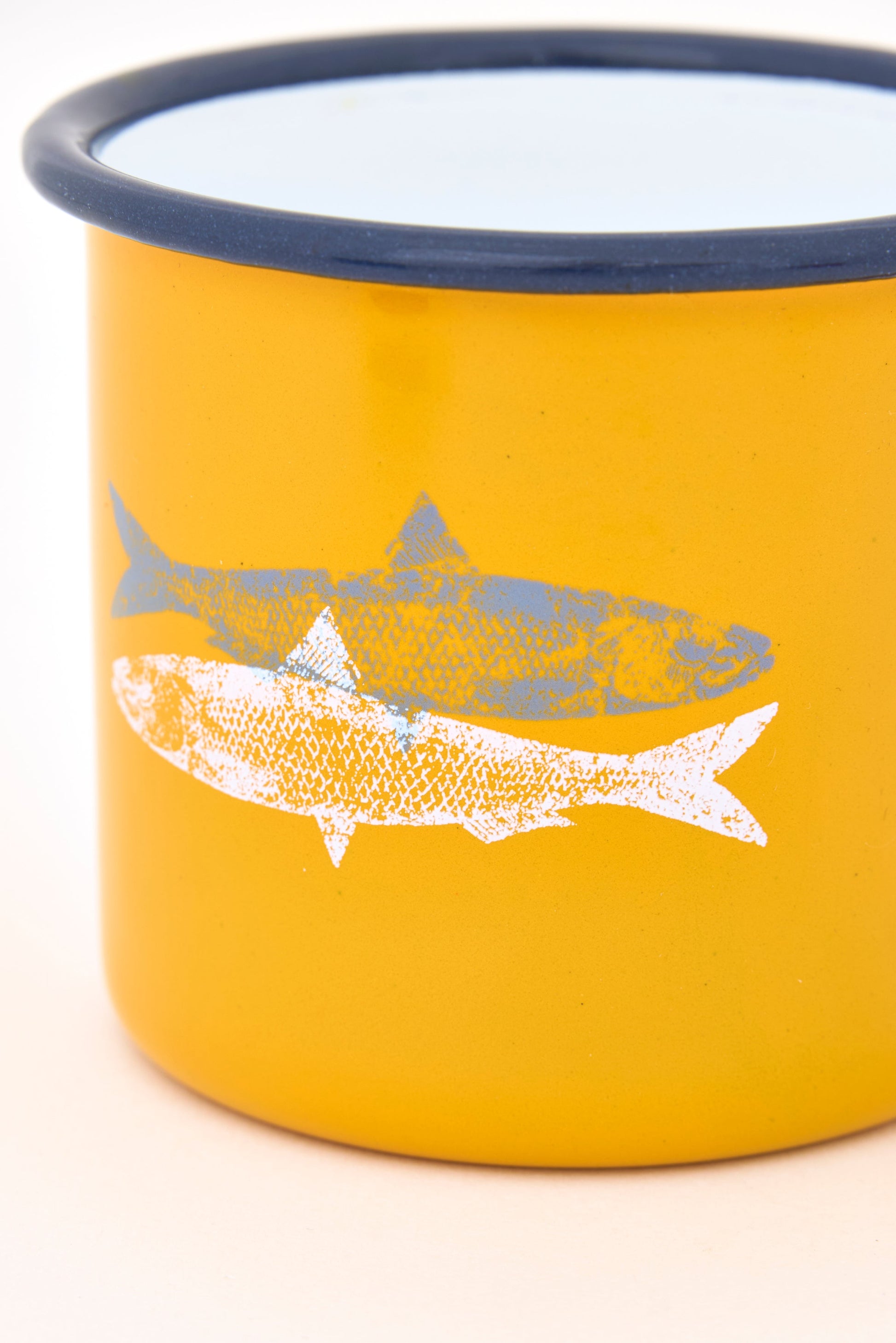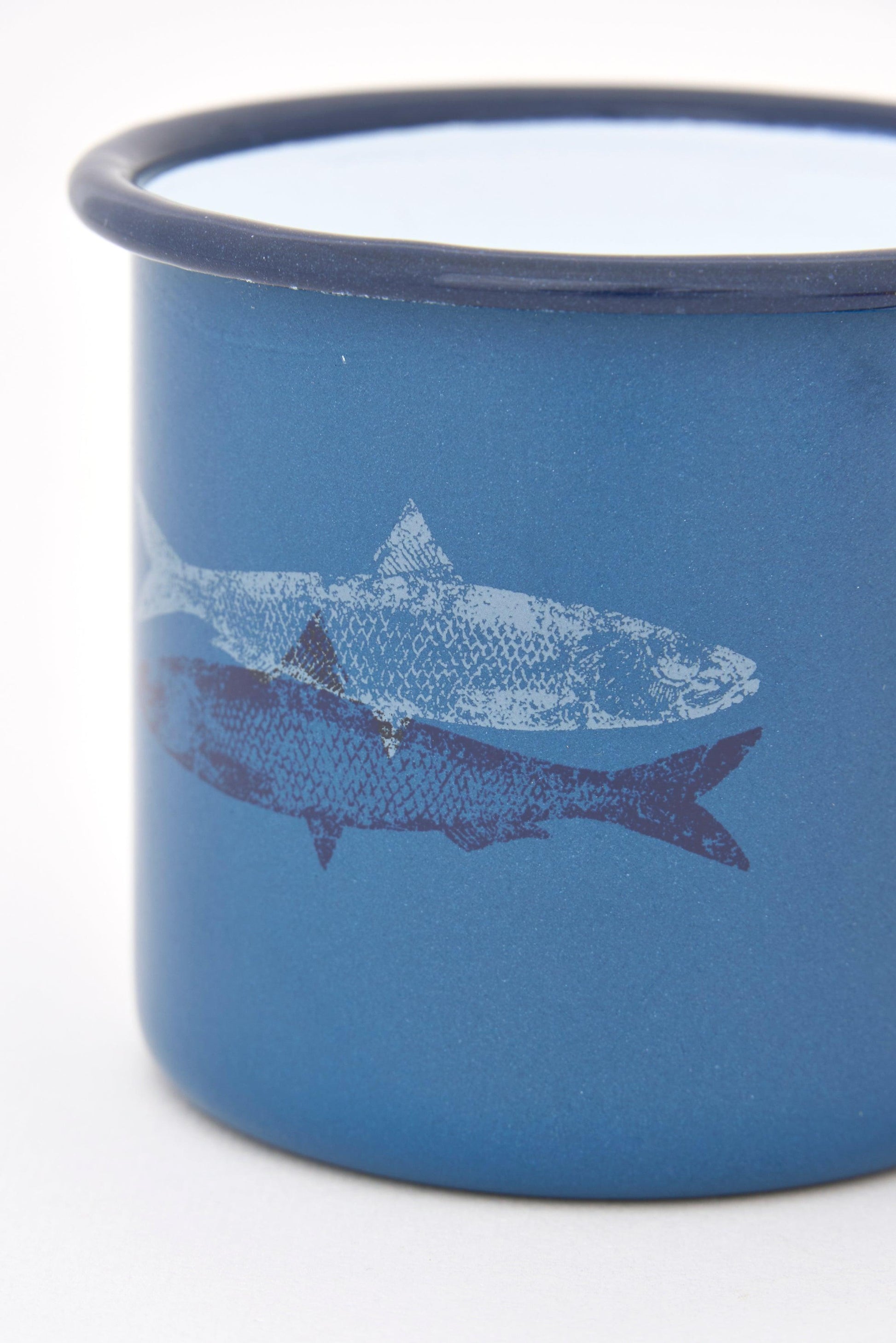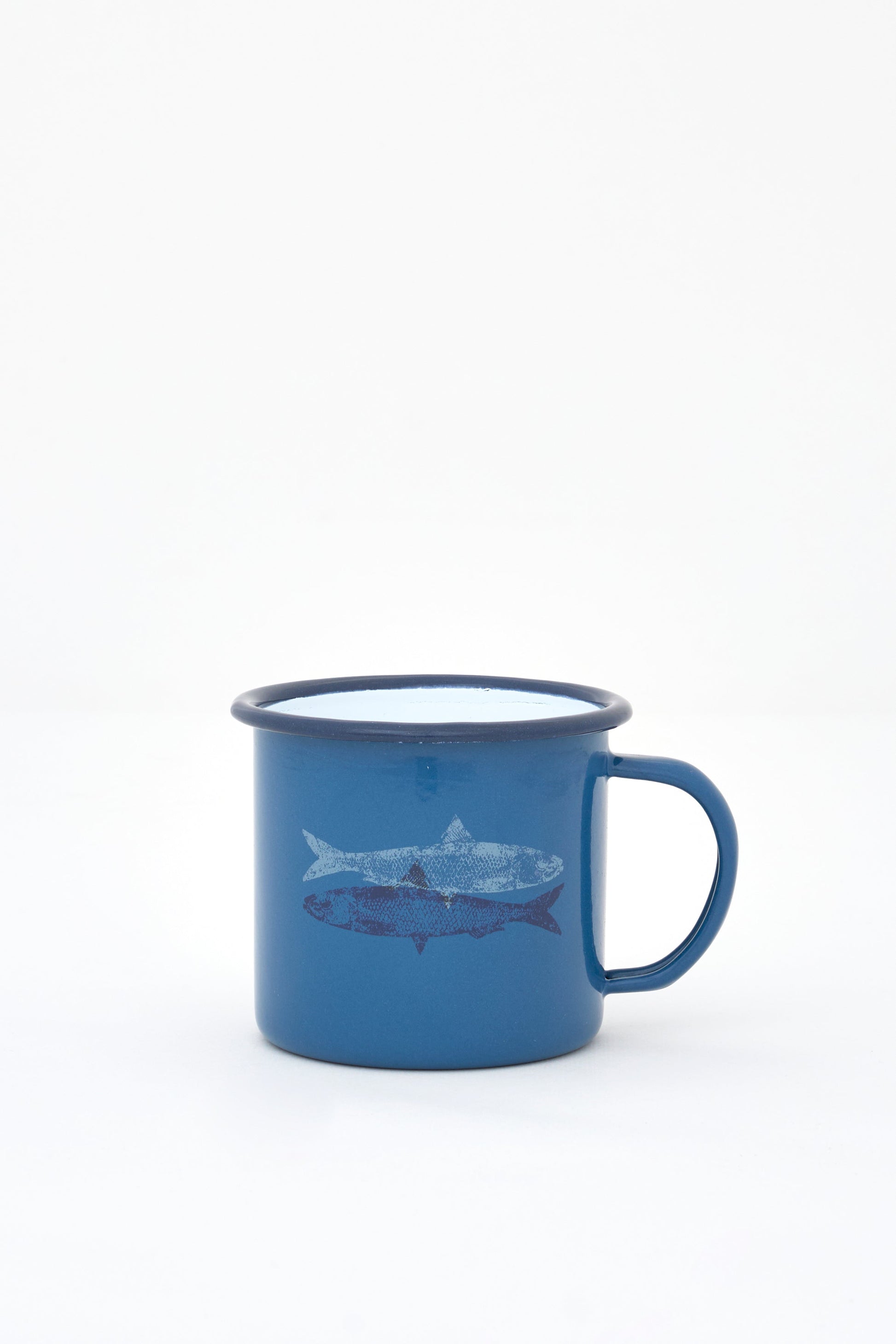 Set de cuatro tazas de esmalte en distintos colores, con ilustración de pez y borde en verde oscuro. Un conjunto práctico y decorativo de inspiración marinera para el día a día.