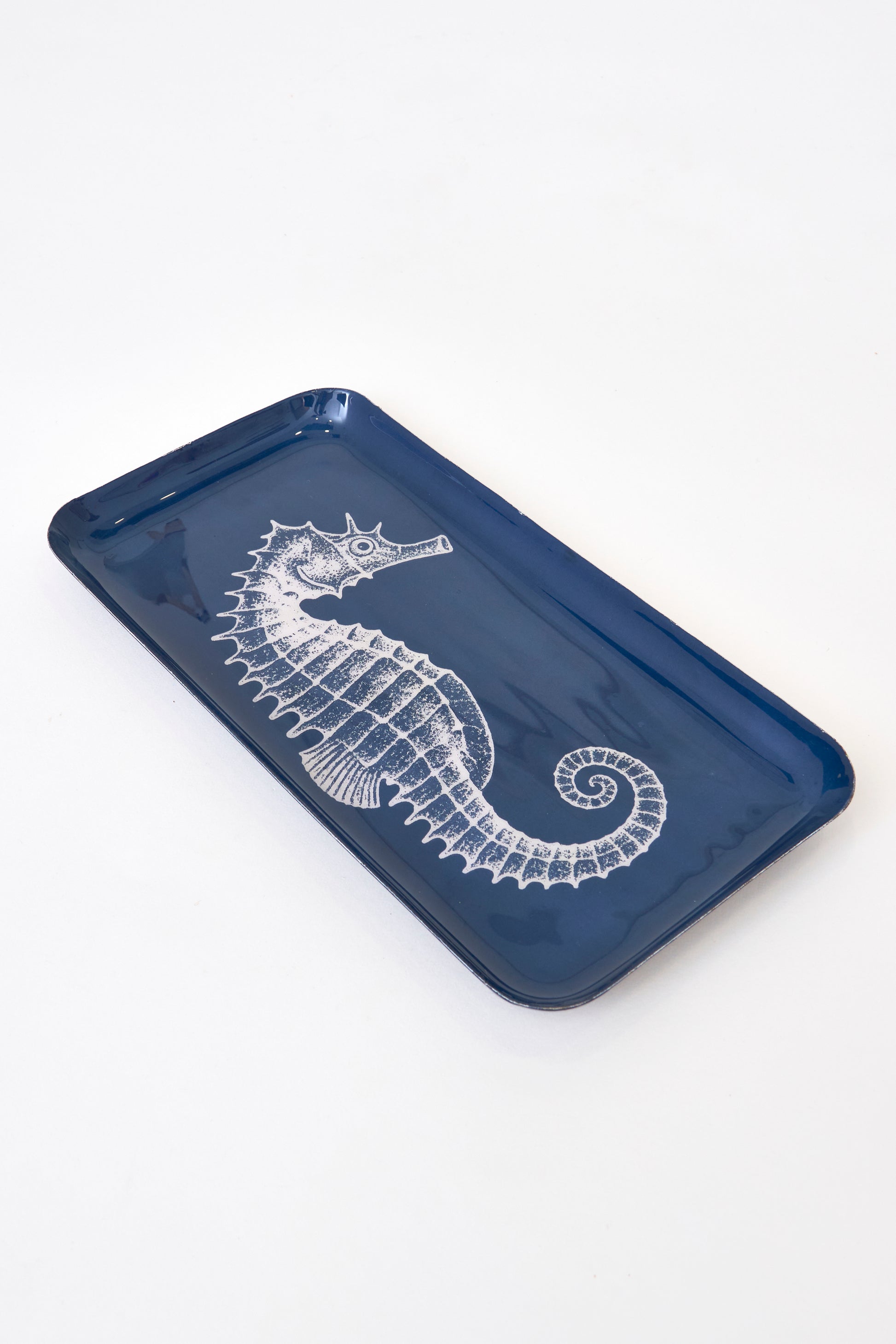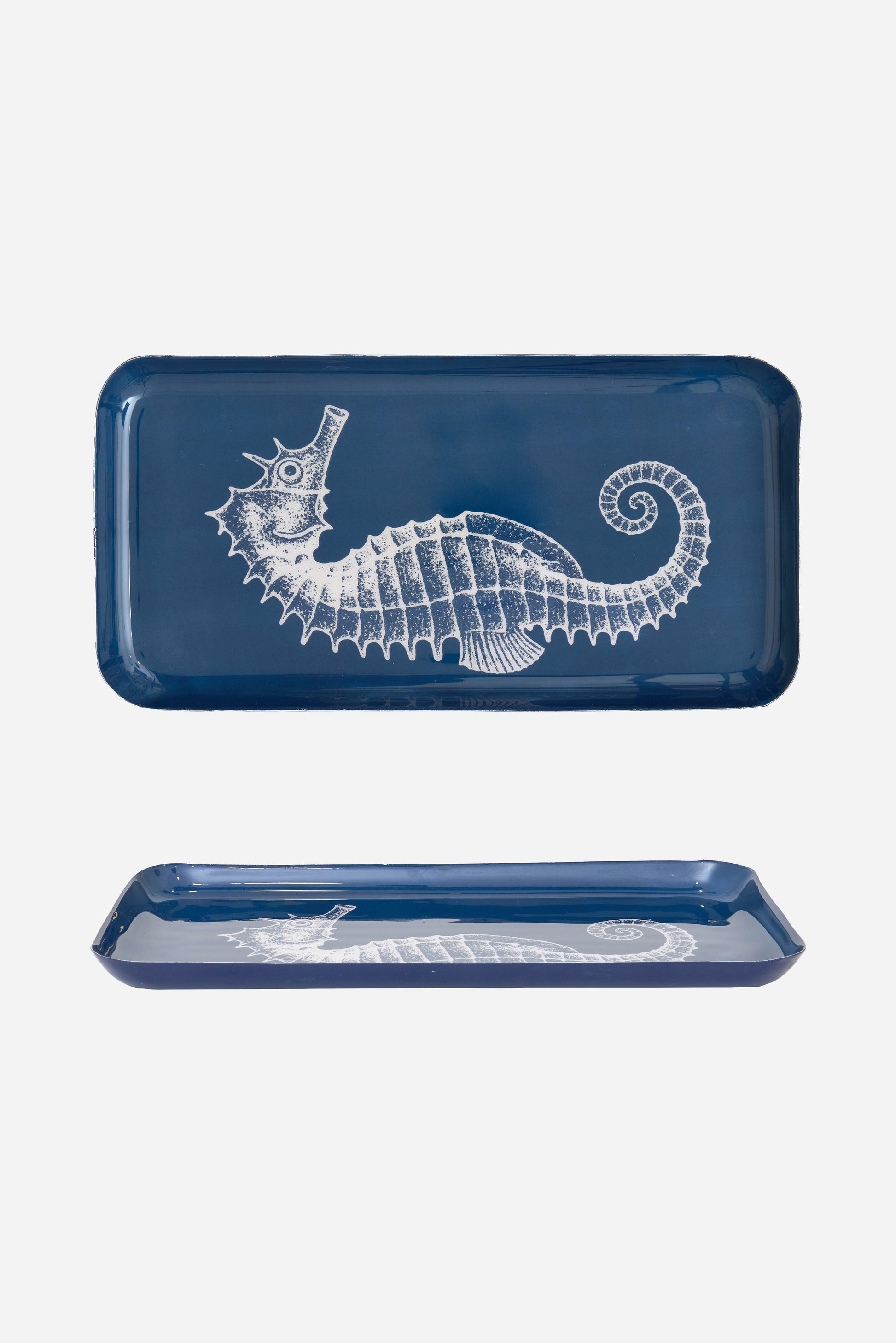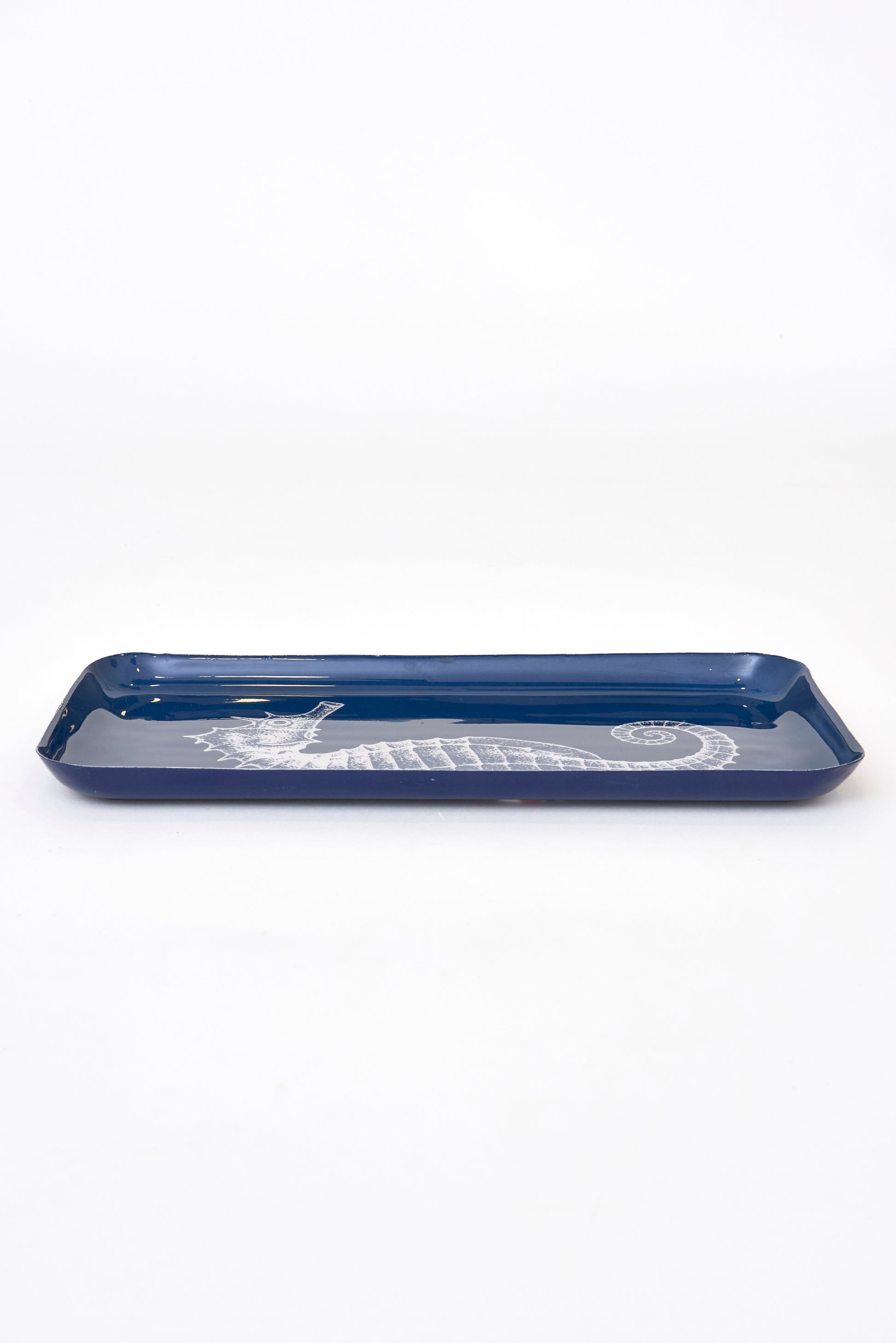 Bandeja decorativa de metal con ilustración de caballito de mar sobre fondo azul intenso. Su formato alargado y diseño elegante la hacen ideal para organizar pequeños objetos o como pieza ornamental