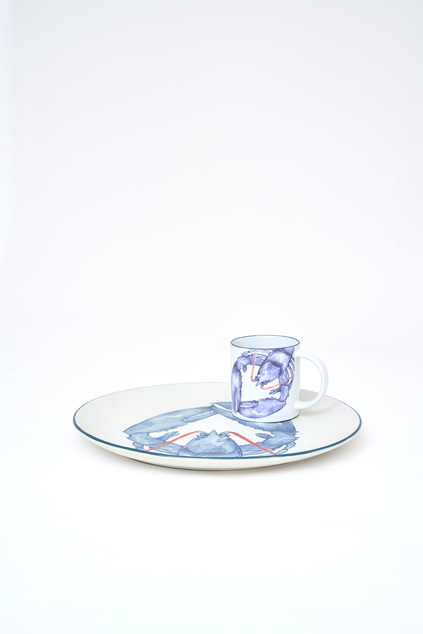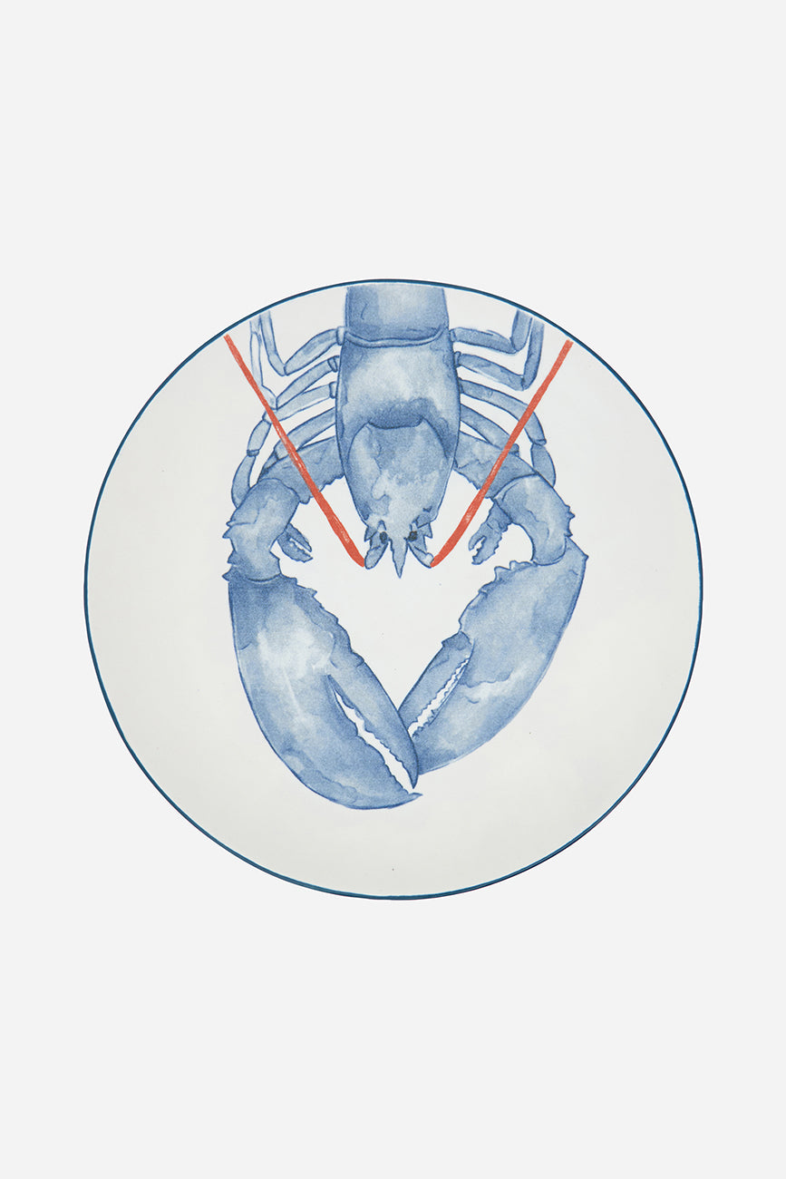 Plato grande elaborado en gres y decorado con una langosta pintada. Válido tanto para el servicio de alimentos como para uso decorativo. Una pieza con marcada inspiración marinera.