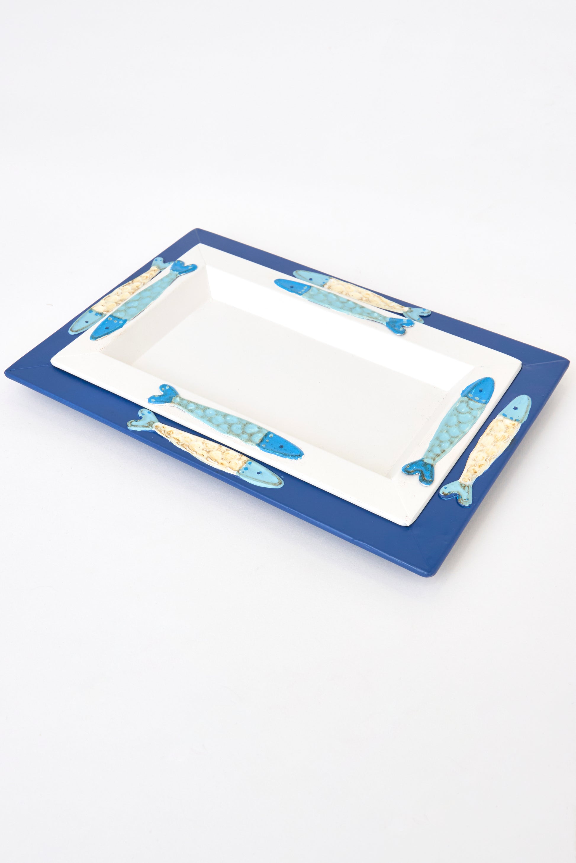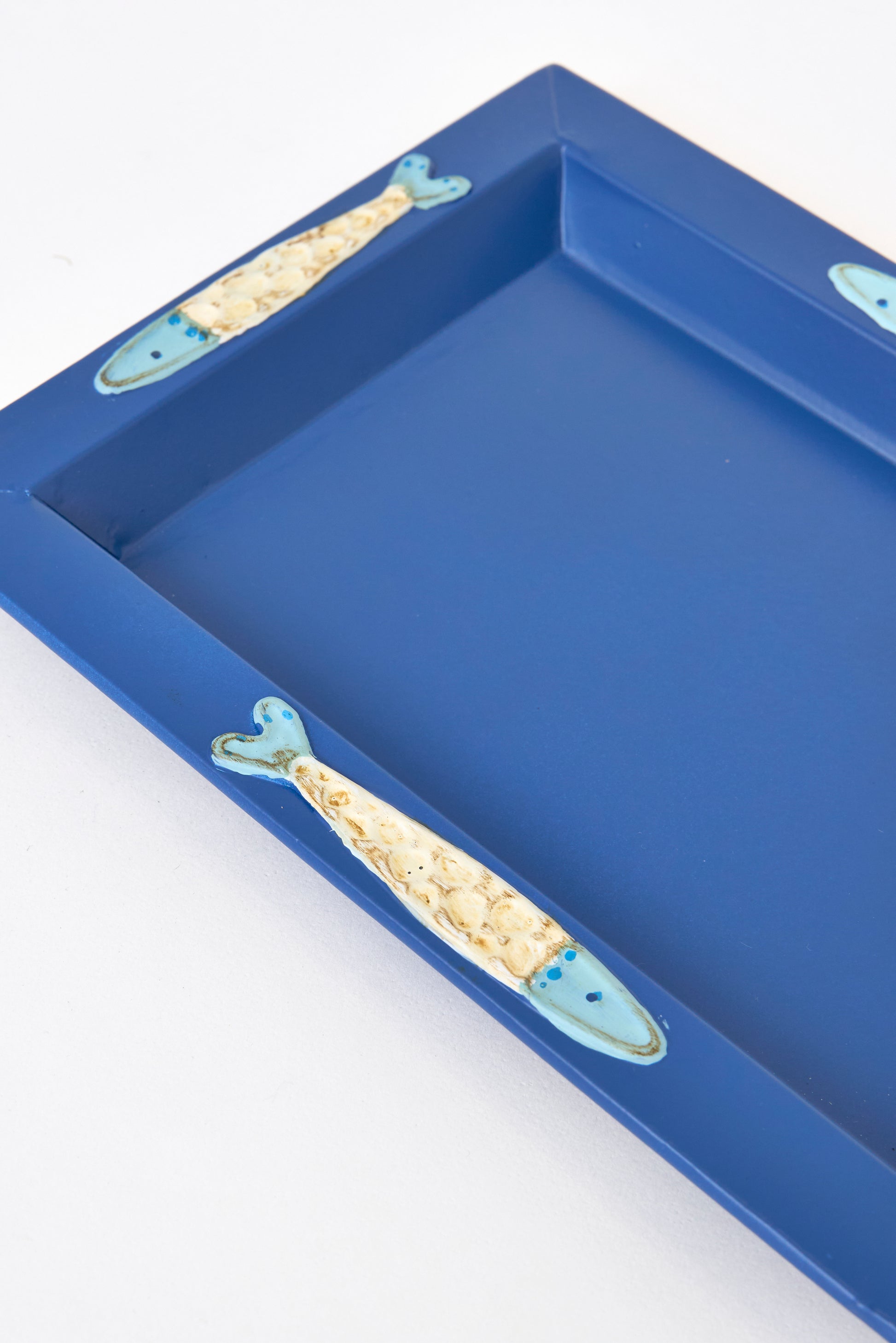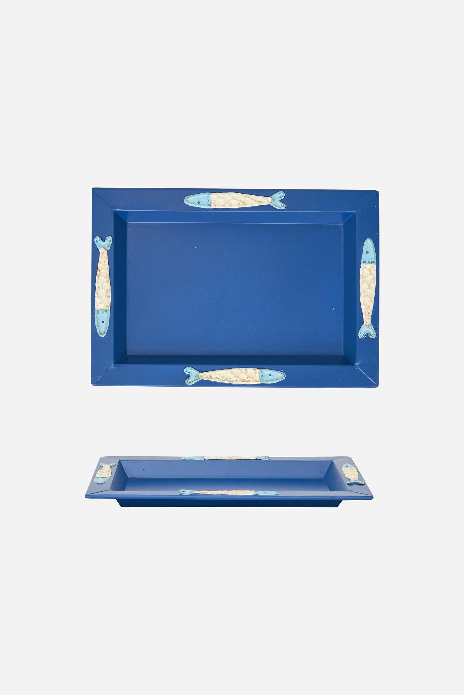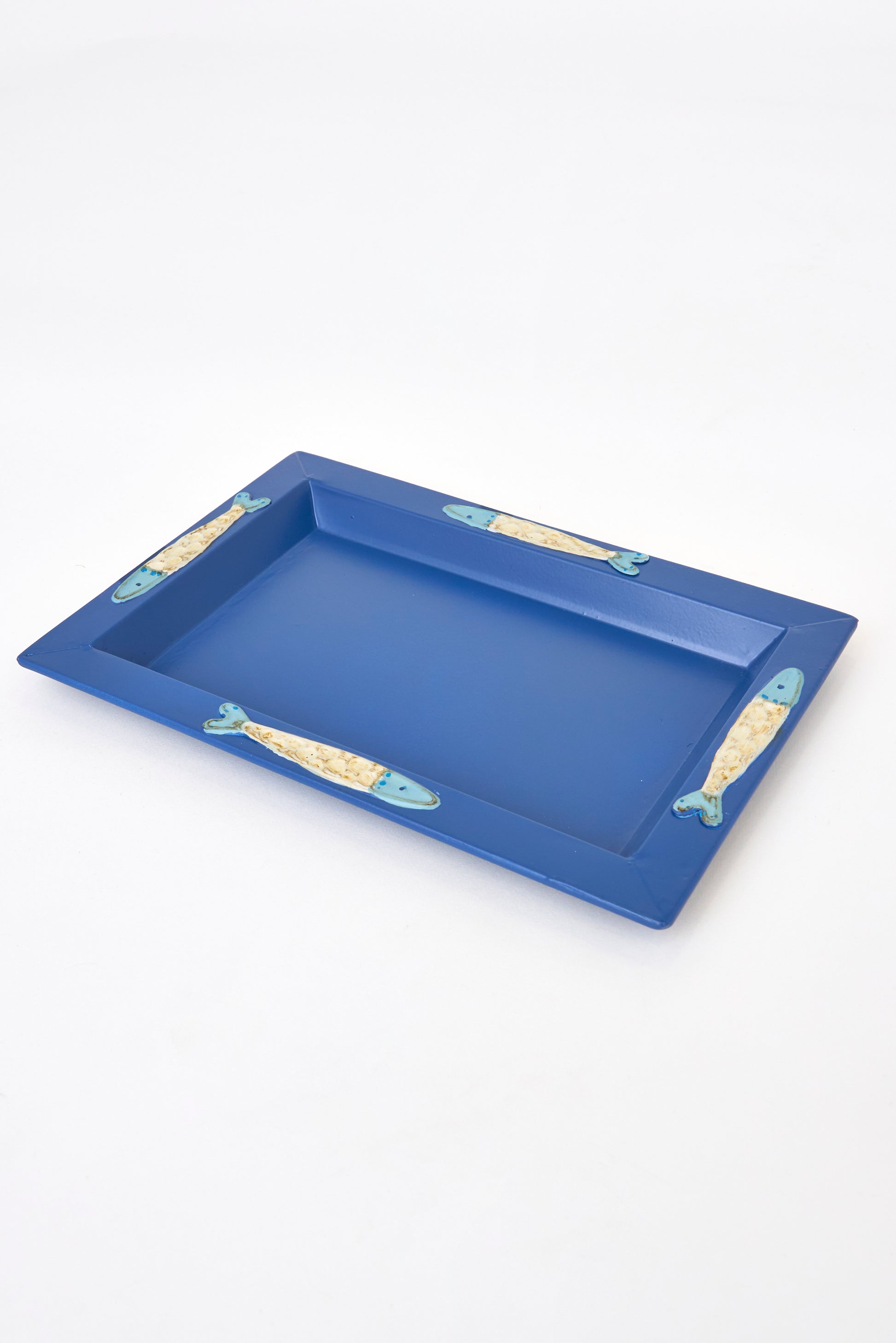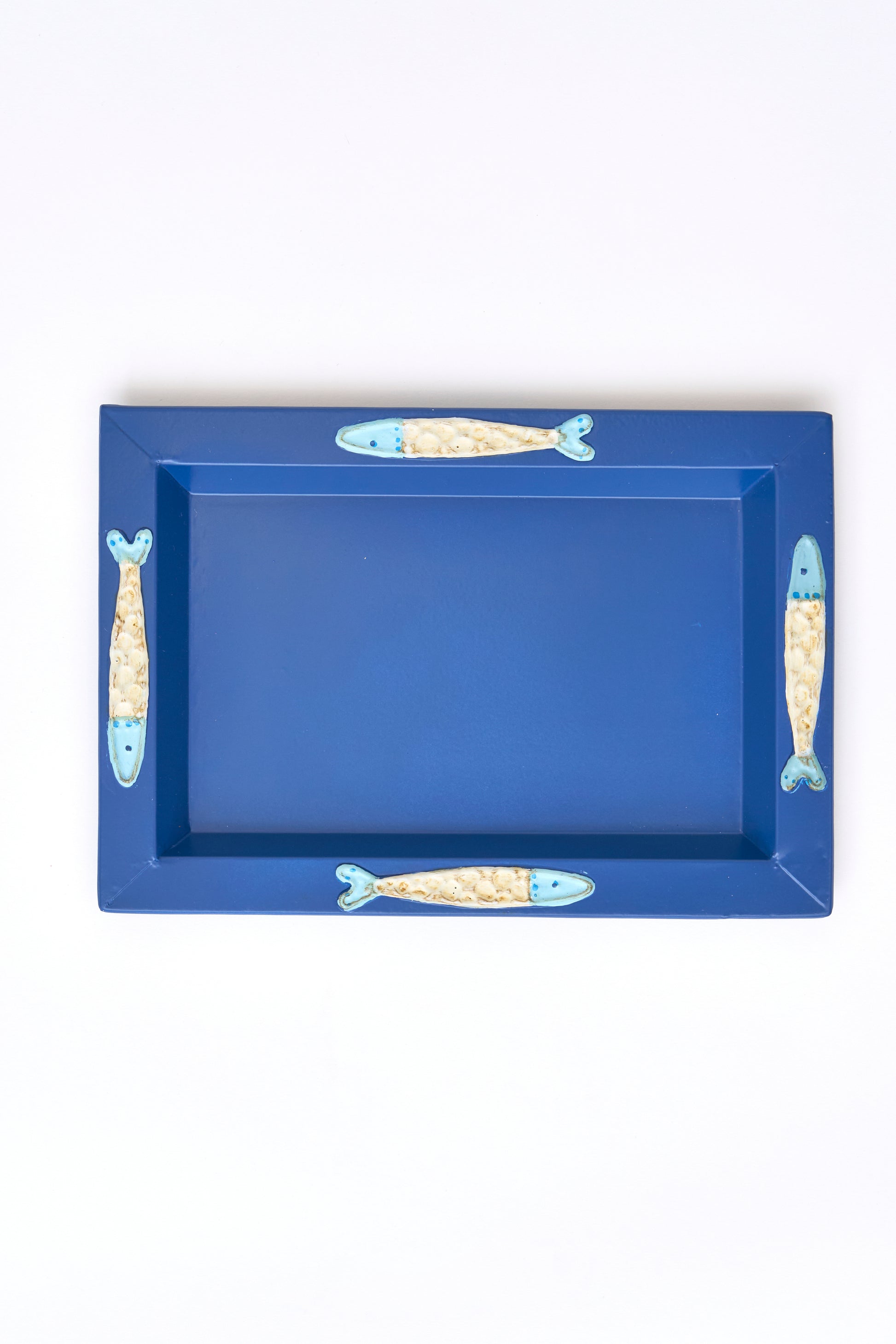Bandeja azul elaborado en hojalata decorado con peces en relieve.