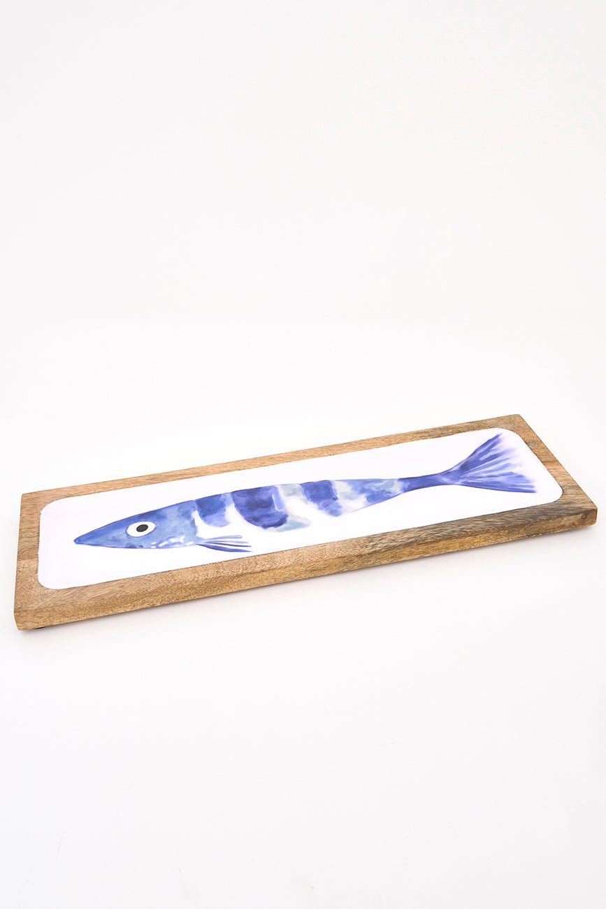 Bandeja de madera con acabado esmaltado y pez pintado como motivo decorativo. Su diseño combina con los bols de banco de peces de la misma colección. Una pieza funcional y decorativa con inspiración marinera.
