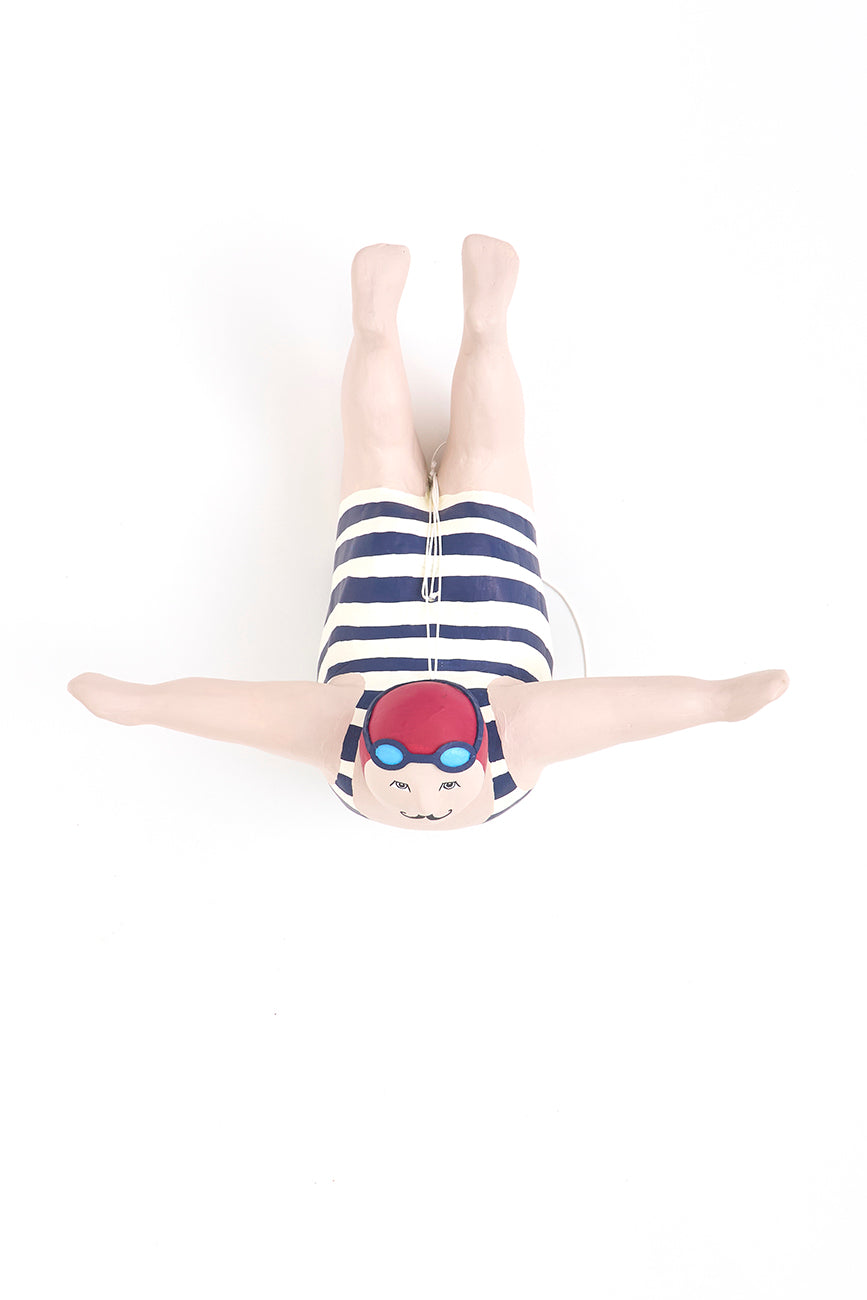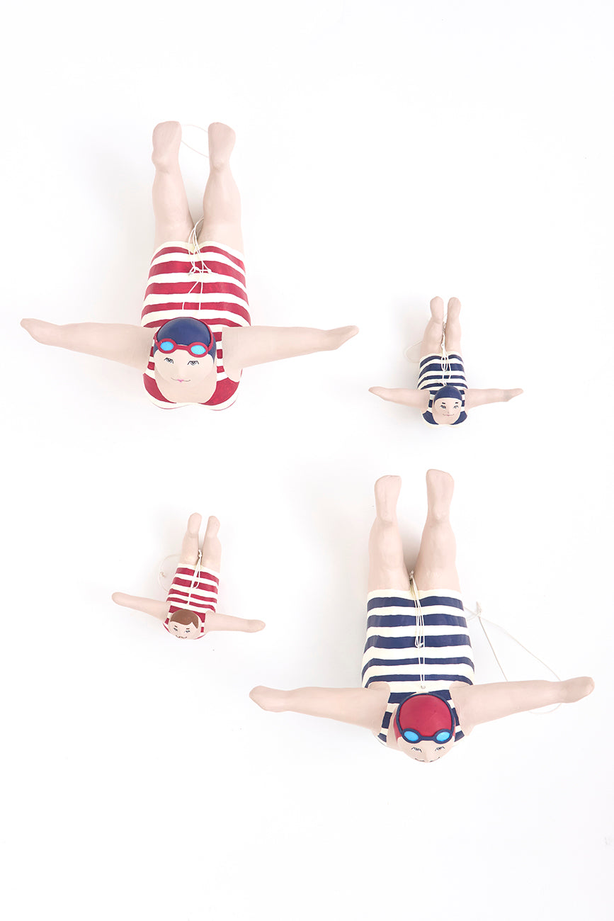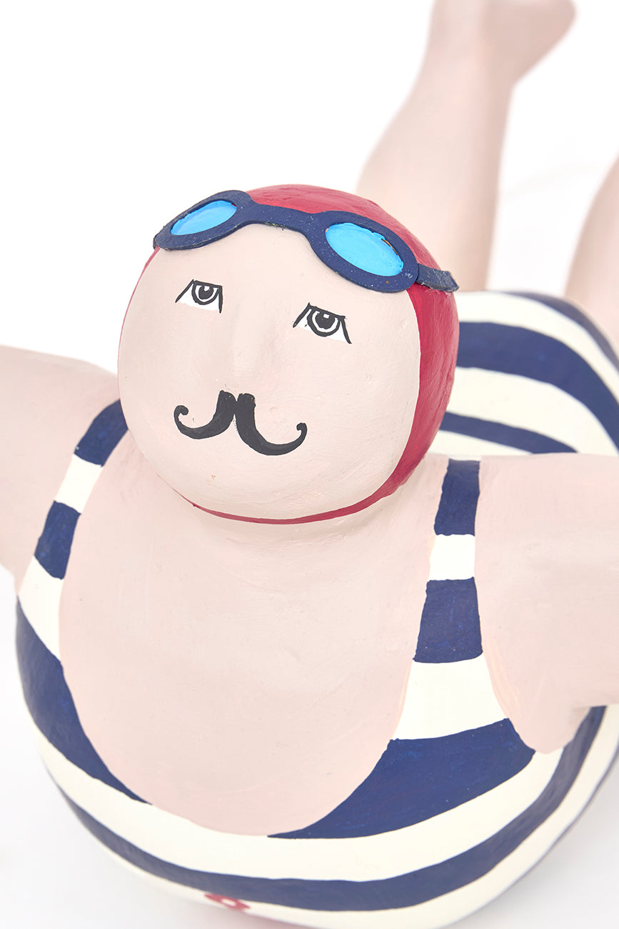 Bañista grande fabricada en papel maché, perfecta para colgar y añadir un encanto único a tu decoración. Esta pieza de arte artesanal captura la esencia del verano y el relax, ideal para decoraciones náuticas o temáticas de playa.