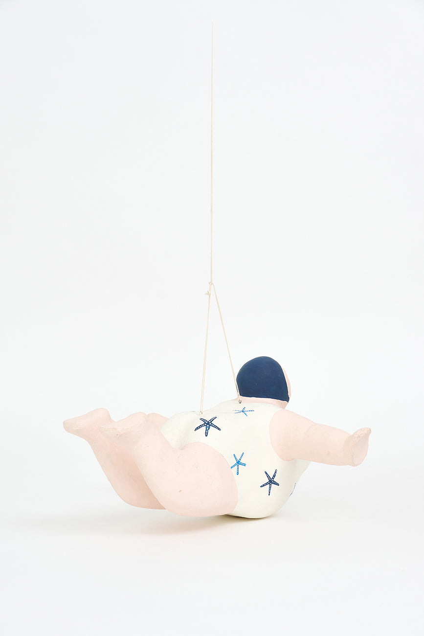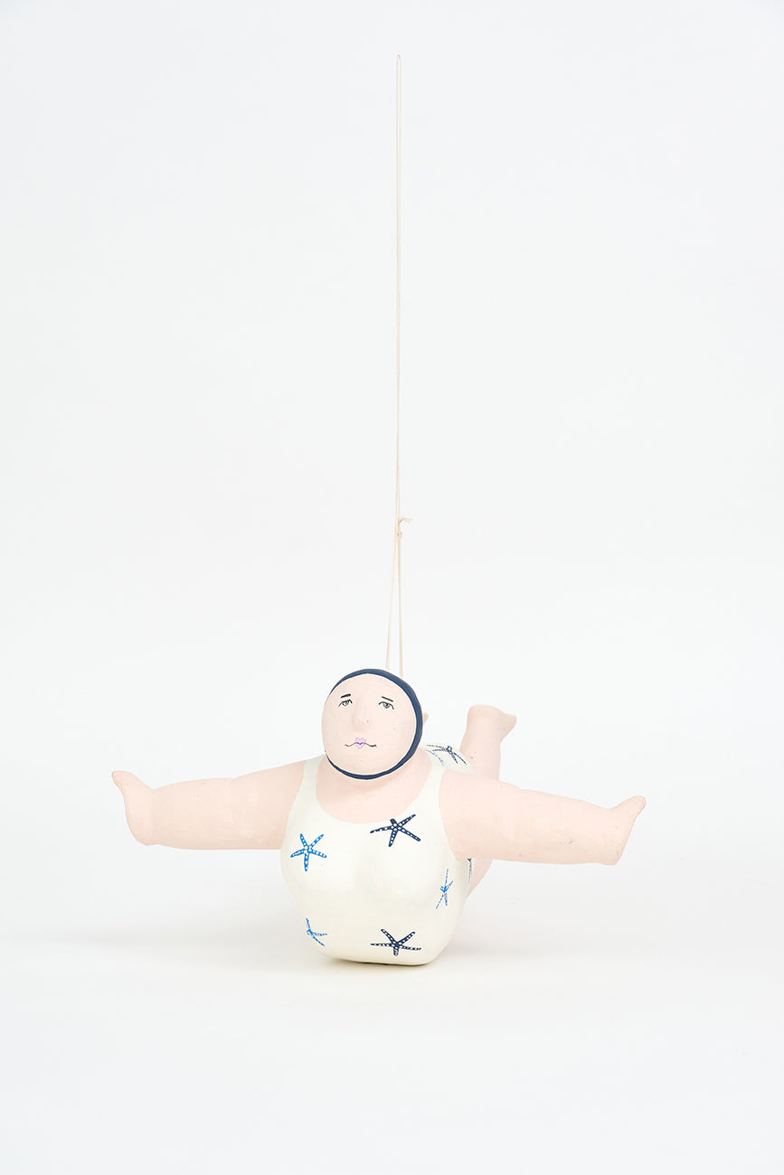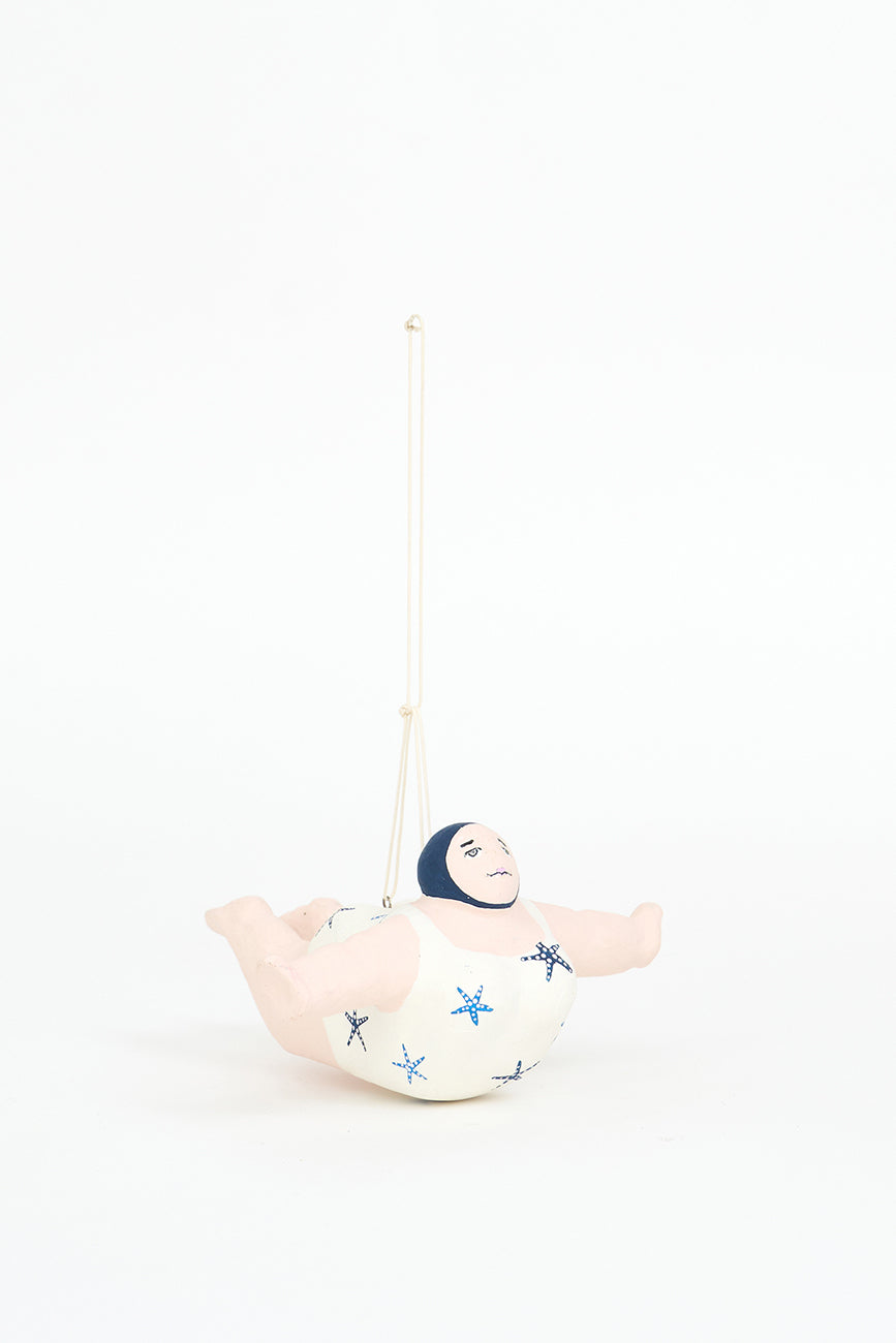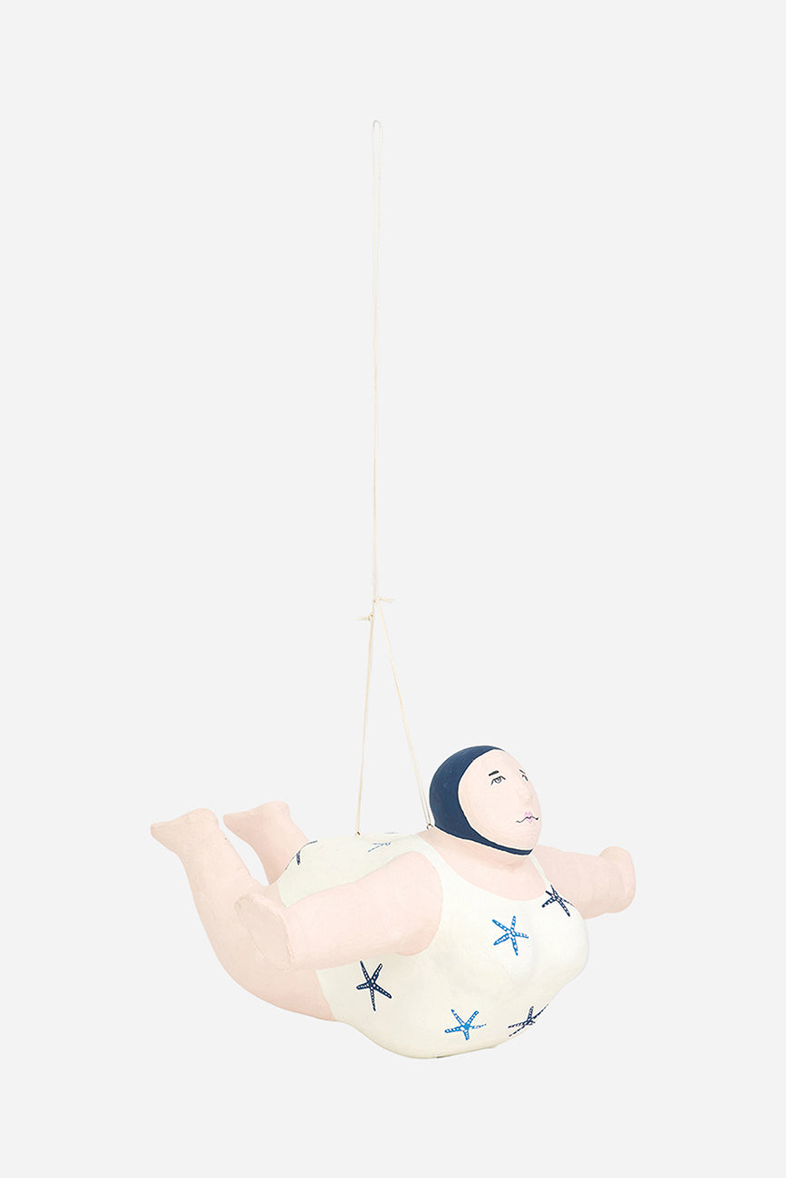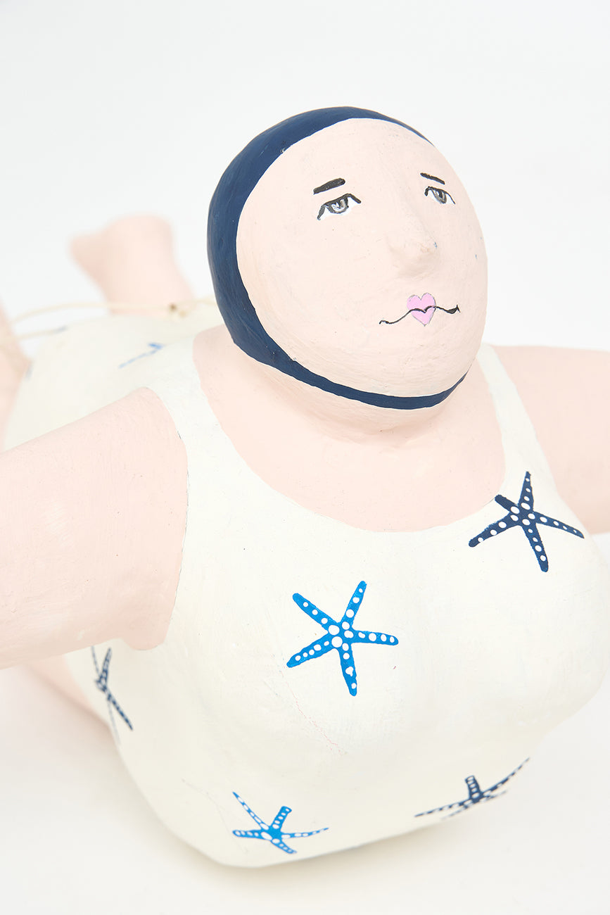 Esta encantadora figura de bañista está elaborada en papel maché y diseñada para colgar, aportando un toque divertido y nostálgico a tu decoración. Luce un alegre traje de baño decorado con estrellas de mar, evocando el espíritu relajado y festivo de los días de playa. Su acabado artesanal y sus detalles cuidadosamente pintados le confieren personalidad y calidez.