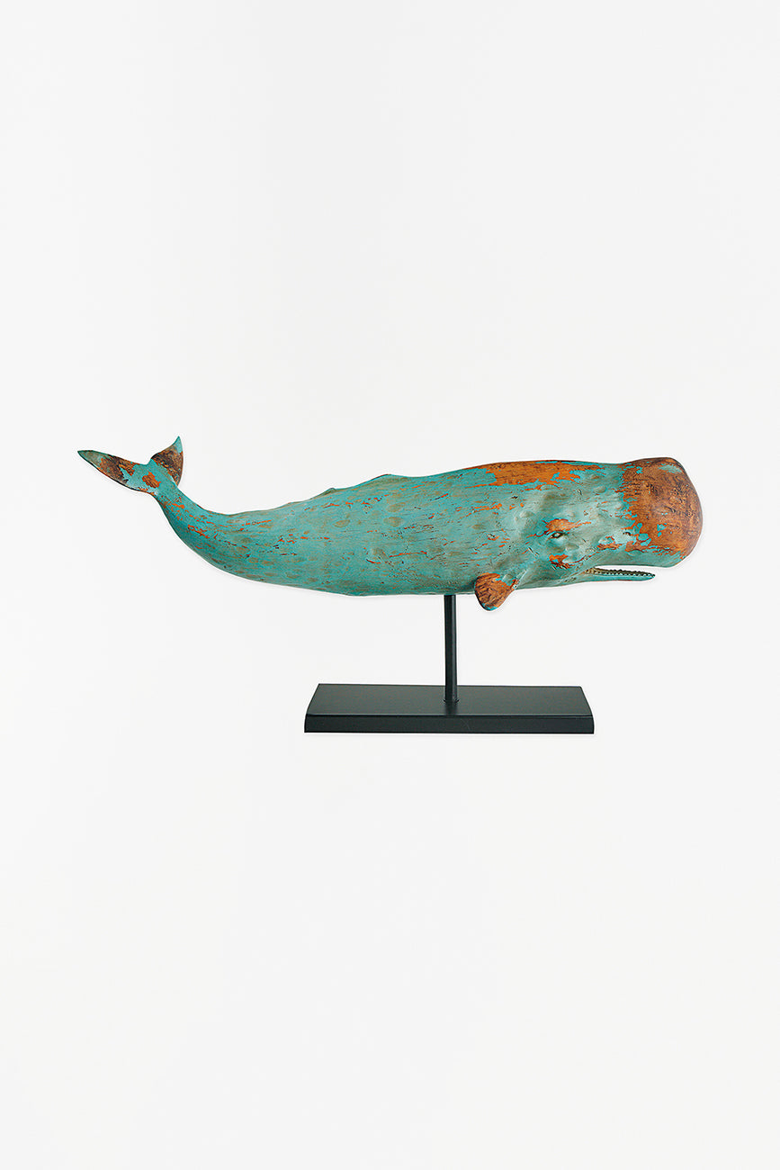 Cachalote o ballena de gran tamaño hecha en resina. Tiene una base metálica y una terminación en madera envejecida.