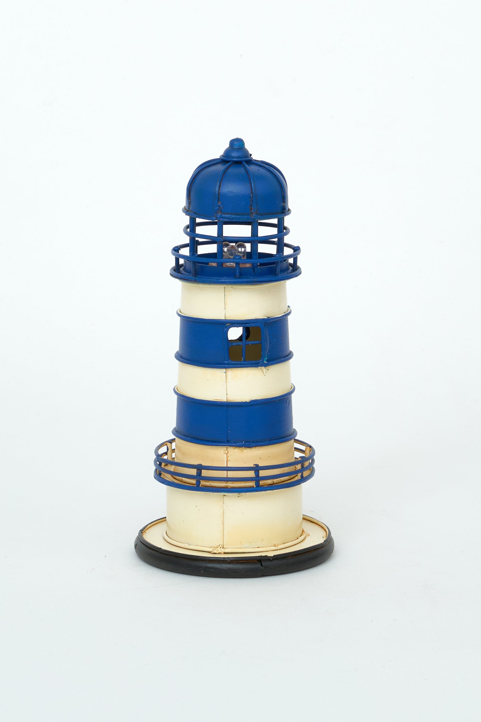 Lámpara decorativa de metal con forma de faro en tonos azul y blanco. Su diseño clásico y estilizado aporta luz ambiental y refuerza una estética marinera limpia y fresca