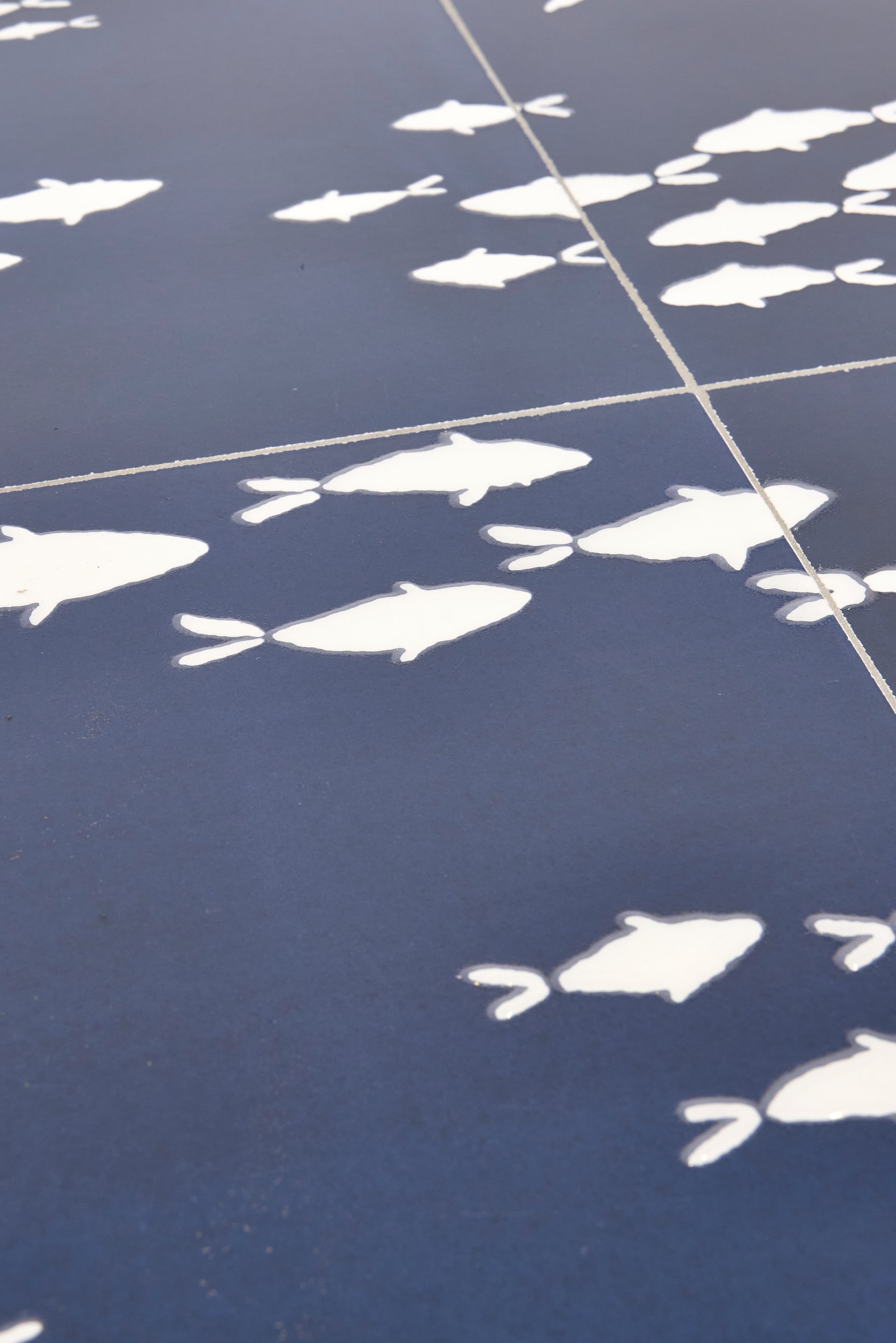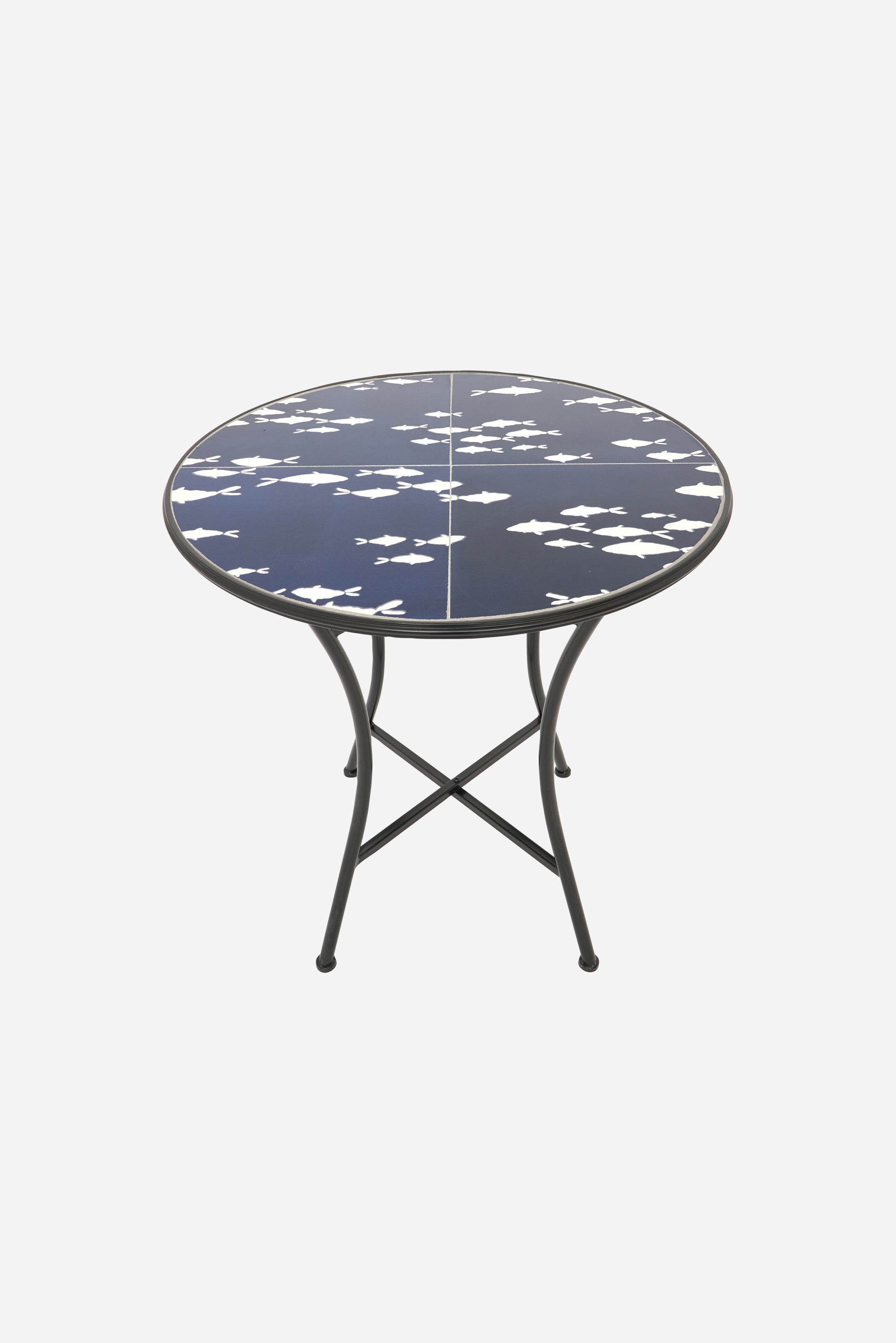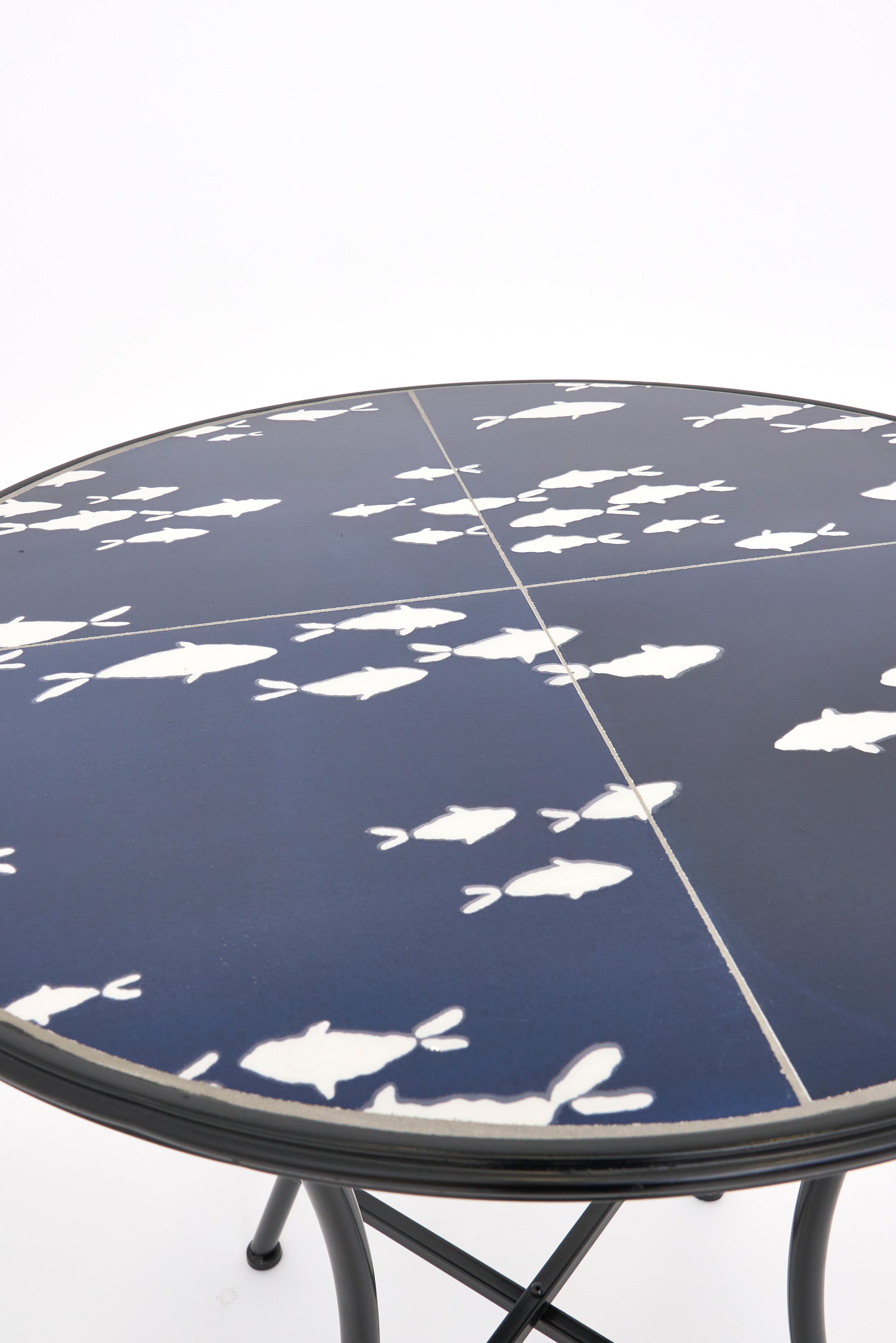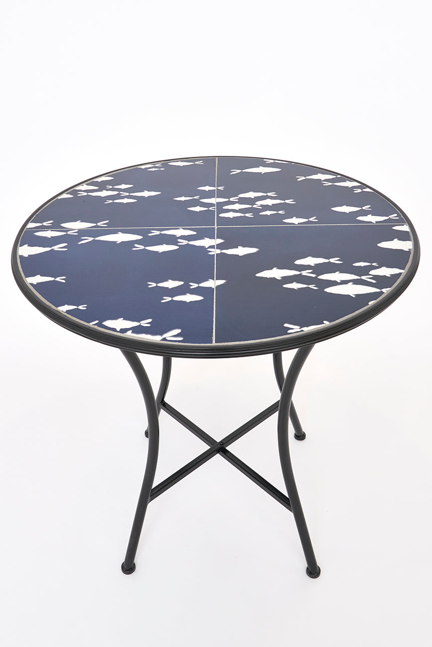 Mesa redonda con tablero decorado mediante técnica mosaico y patrón repetido de peces sobre fondo azul marino. El contraste con las patas metálicas negras aporta un equilibrio visual elegante y ligero