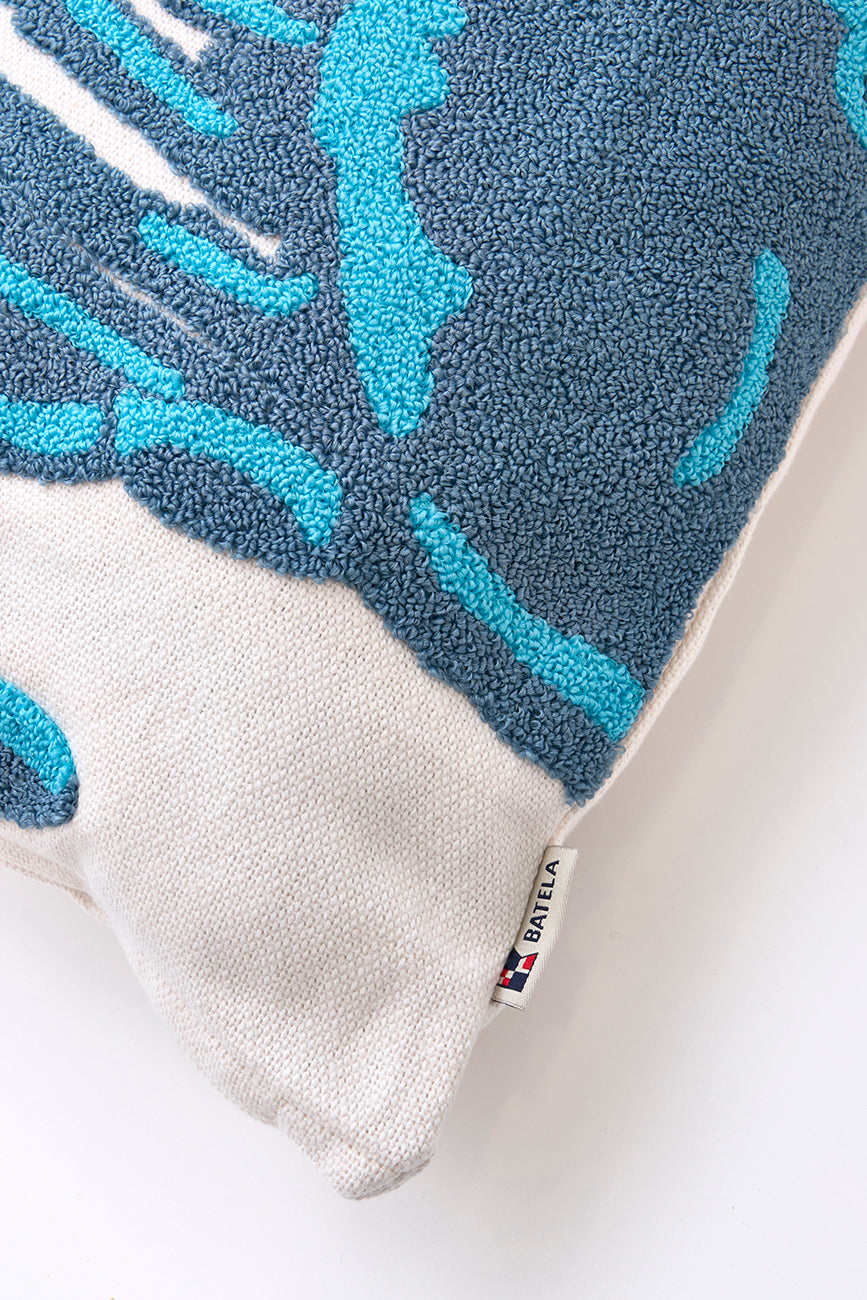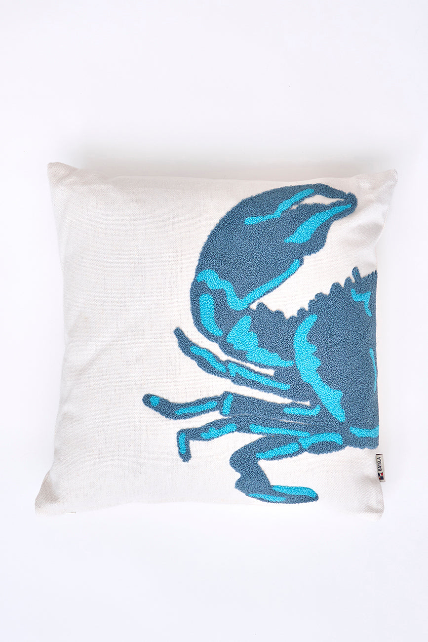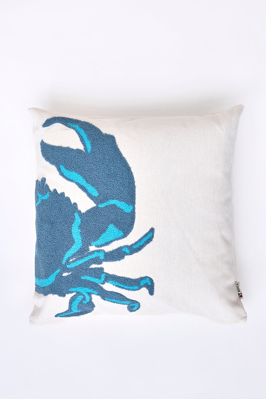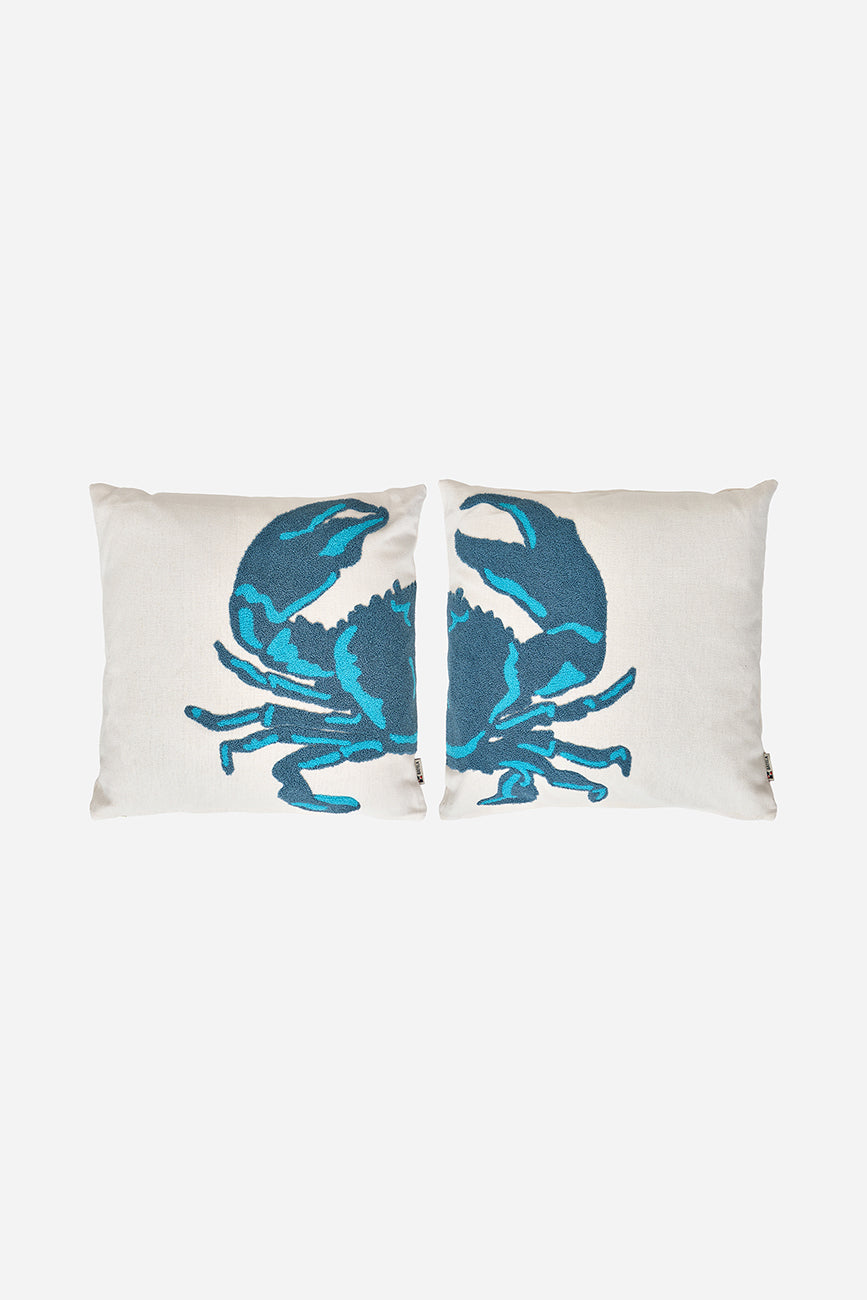 Set de dos cojines decorados con un cangrejo bordado dividido entre ambas piezas.