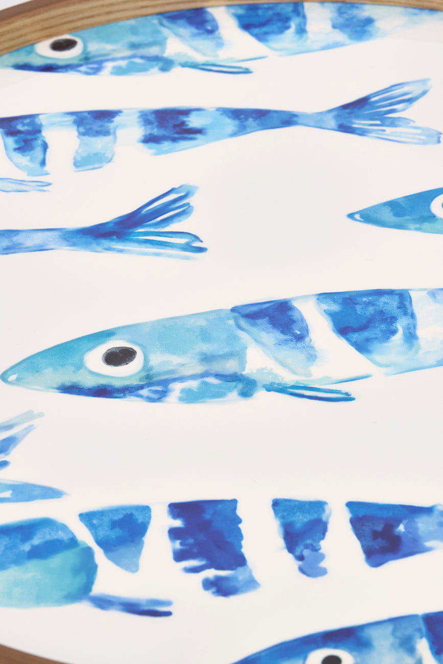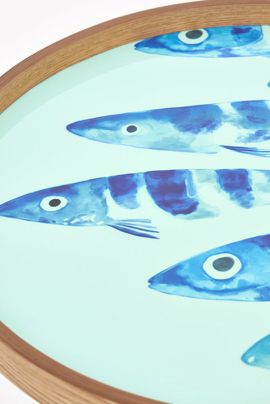 Set de tres mesas redondas de madera con la parte superior esmaltada. El sobre está decorado con un diseño de banco de peces. Las patas son desmontables, lo que facilita su transporte y almacenaje.