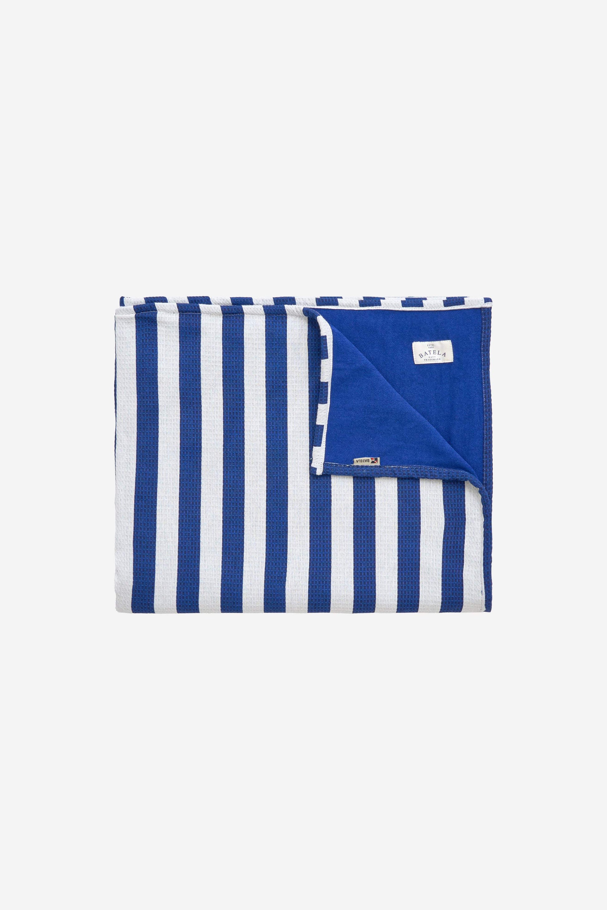 Toalla elaborada en algodón con diseño a rayas blancas y azules.